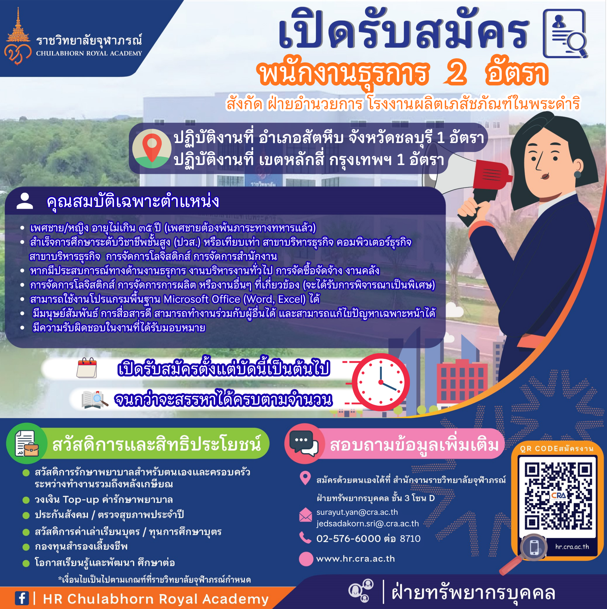 หากมีประสบการณ์ทางด้านงานธรุการ งานบริหารงานทั่วไป การจัดซื้อจัดจ้าง งานคลัง การจัดการโลจิสติกส์ การจัดการการผลิต หรืองานอื่นๆ ที่เกี่ยวข้อง (จะได้รับการพิจารณาเป็นพิเศษ)