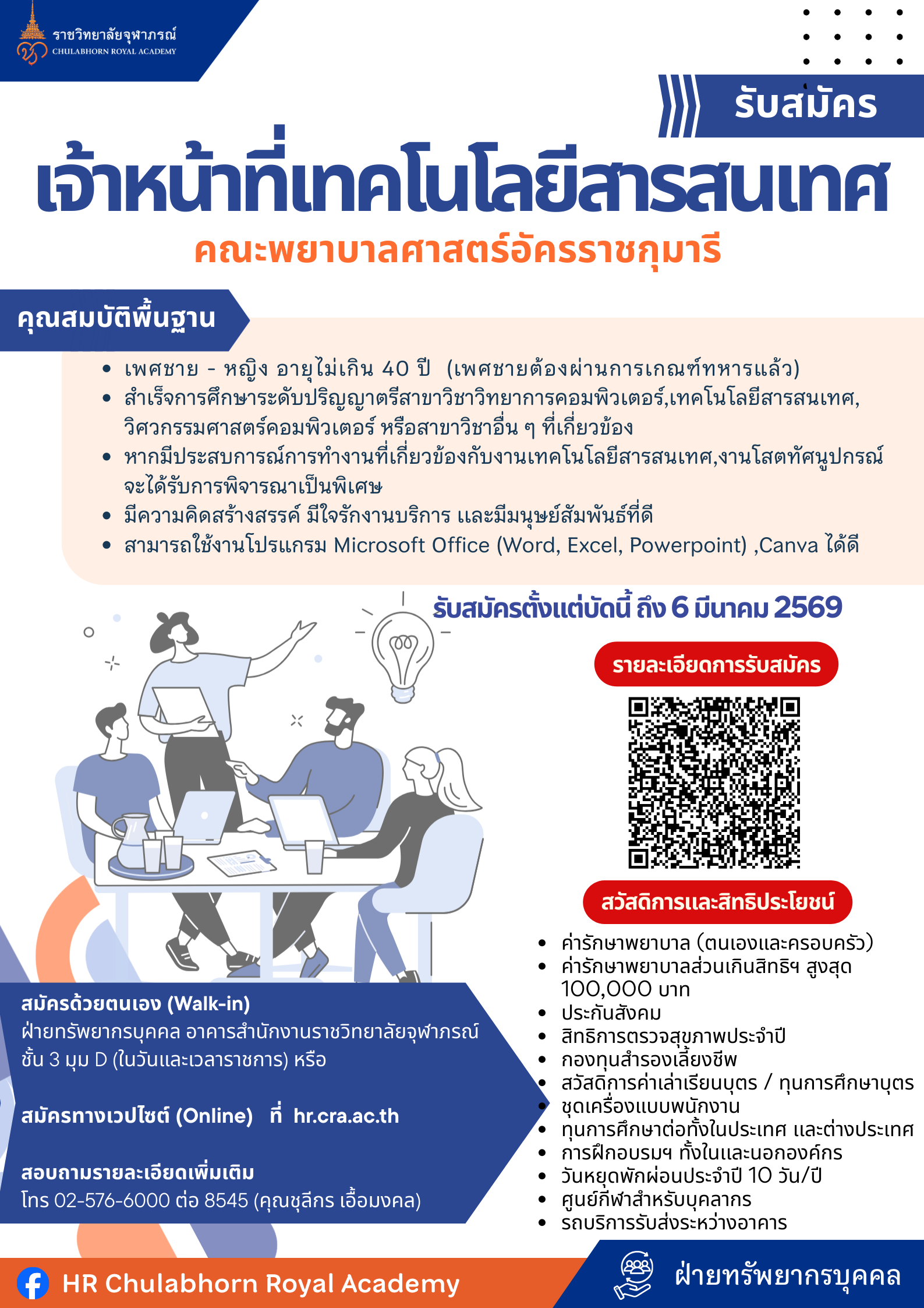 - และหากผู้เข้ารับการสอบสัมภาษณ์ฯ ได้ผ่านการคัดเลือกให้เข้าปฏิบัติงาน ท่านต้องยื่นผลการทดสอบความสามารถด้านภาษาอังกฤษ ที่ผ่านตามระดับคะแนนที่ราชวิทยาลัยกำหนด ภายใน ๑๘๐ วัน หลังจากวันเริ่มปฏิบัติงาน จึงจะได้รับการบรรจุเป็นผู้ปฏิบัติงานในราชวิทยาลัย