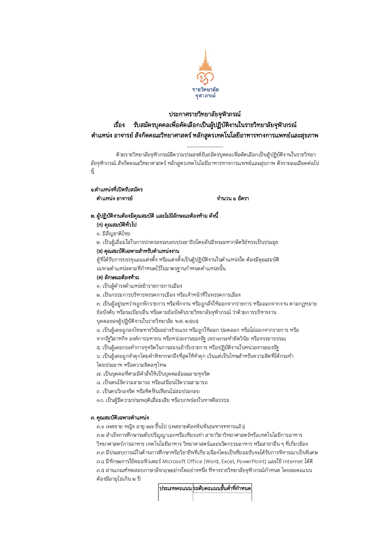 ๒ สำเร็จการศึกษาระดับปริญญาเอกหรือเทียบเท่า สาขาวิชาวิทยาศาสตร์หรือเทคโนโลยี การอาหารวิทยาศาสตร์การอาหาร เทคโนโลยีอาหาร วิทยาศาสตร์ และนวัตกรรมอาหาร หรือสาขาอื่น ๆ ที่เกี่ยวข้อง
