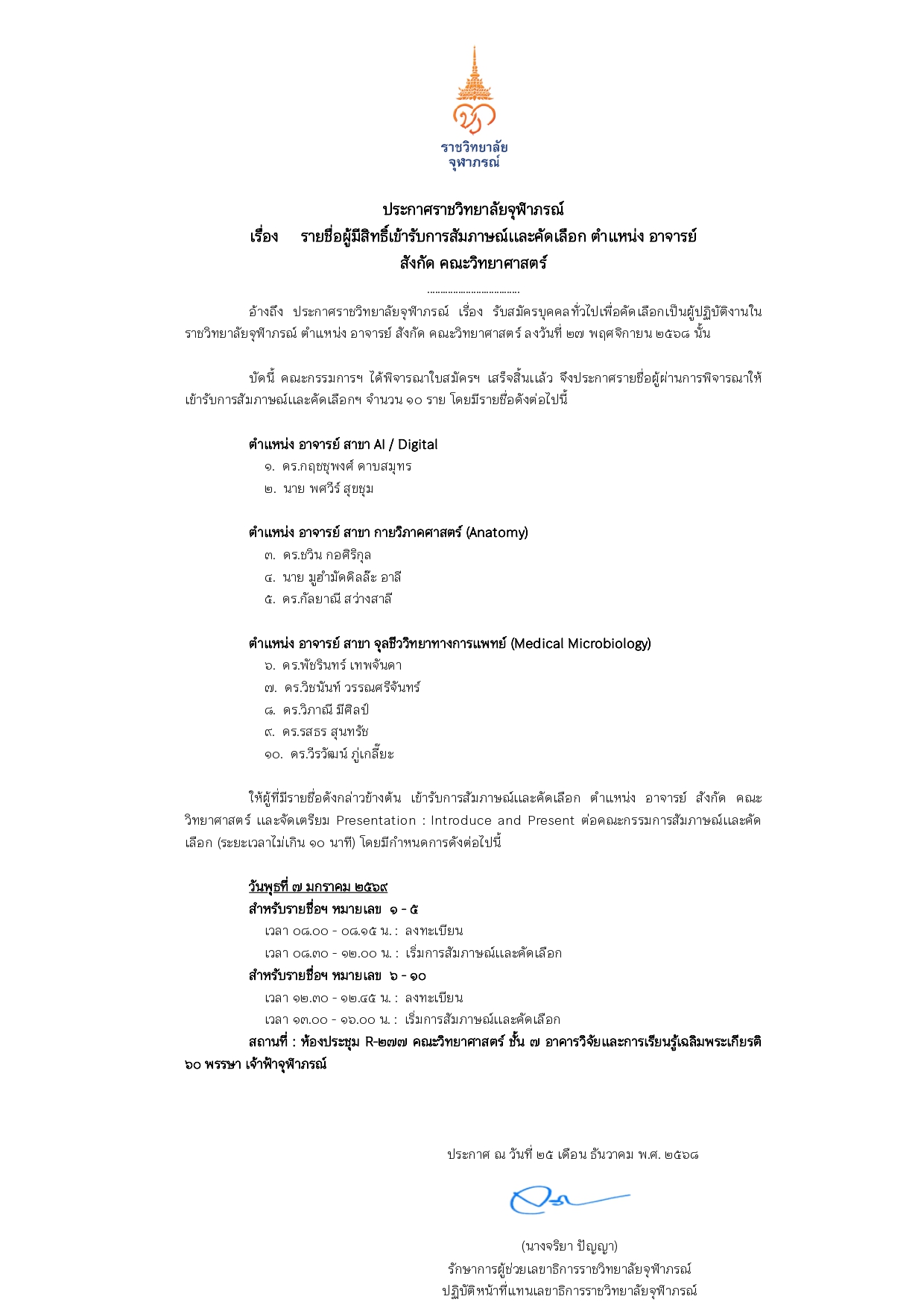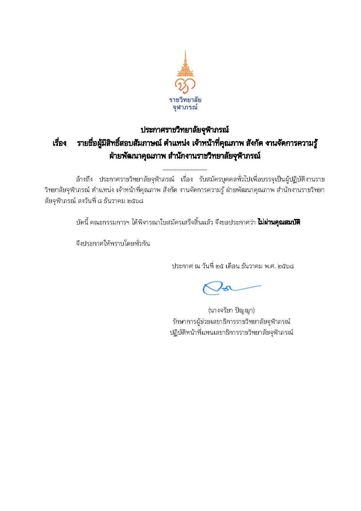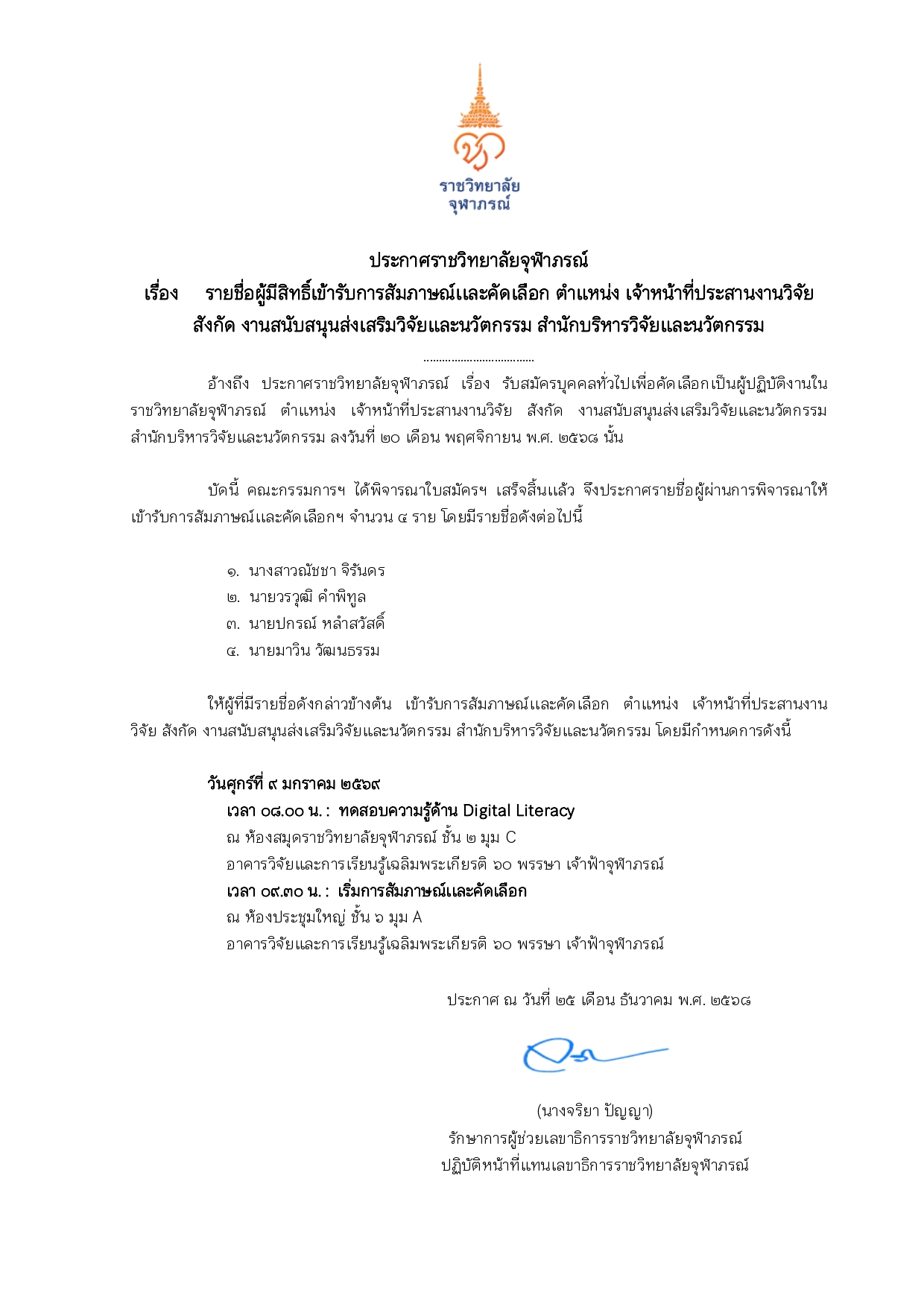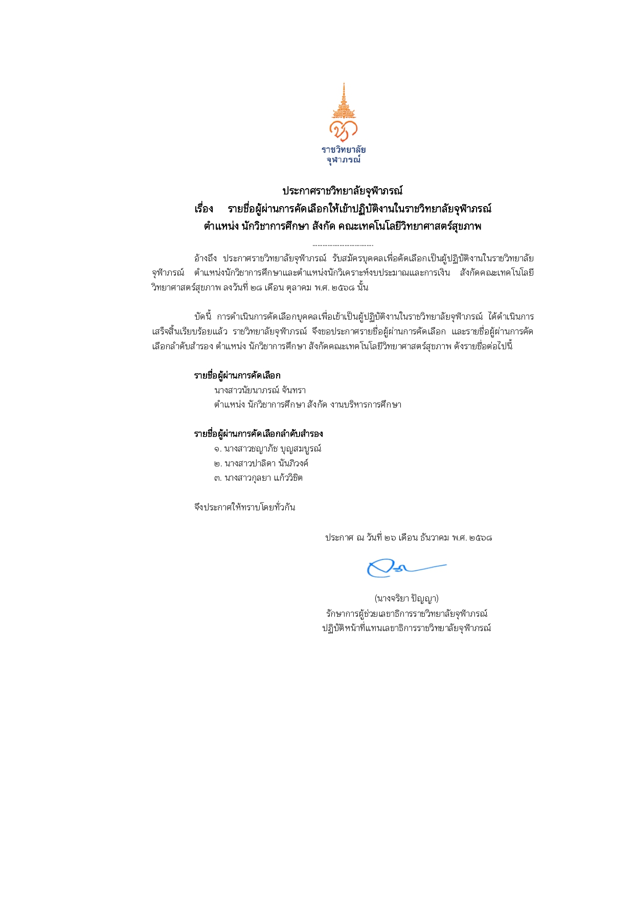 ประกาศรายชื่อผู้ผ่านการคัดเลือกให้เข้าปฏิบัติงานในราชวิทยาลัยจุฬาภรณ์ ตำแหน่ง นักวิชาการศึกษา สังกัด คณะเทคโนโลยีวิทยาศาสตร์สุขภาพ ณ วันที่ 26/12/2568