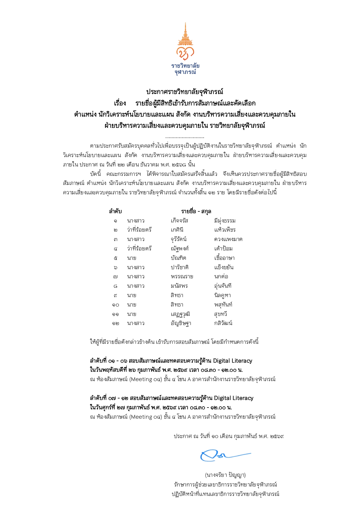 ประกาศรายชื่อผู้มีสิทธิเข้ารับการสัมภาษณ์และคัดเลือก ตำแหน่ง นักวิเคราะห์นโยบายและแผน สังกัด งานบริหารความเสี่ยงและควบคุมภายใน ฝ่ายบริหารความเสี่ยงและควบคุมภายใน ราชวิทยาลัยจุฬาภรณ์