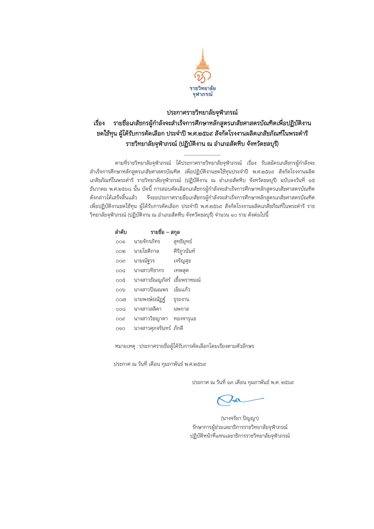 รายชื่อเภสัชกรผู้กำลังจะสำเร็จการศึกษาหลักสูตรเภสัชศาสตรบัณฑิตเพื่อปฏิบัติงานชดใช้ทุน ผู้ได้รับการคัดเลือก ประจำปี พ.ศ.๒๕๖๙ สังกัดโรงงานผลิตเภสัชภัณฑ์ในพระดำริ ราชวิทยาลัยจุฬาภรณ์ (ปฏิบัติงาน ณ อำเภอสัตหีบ จังหวัดชลบุรี)