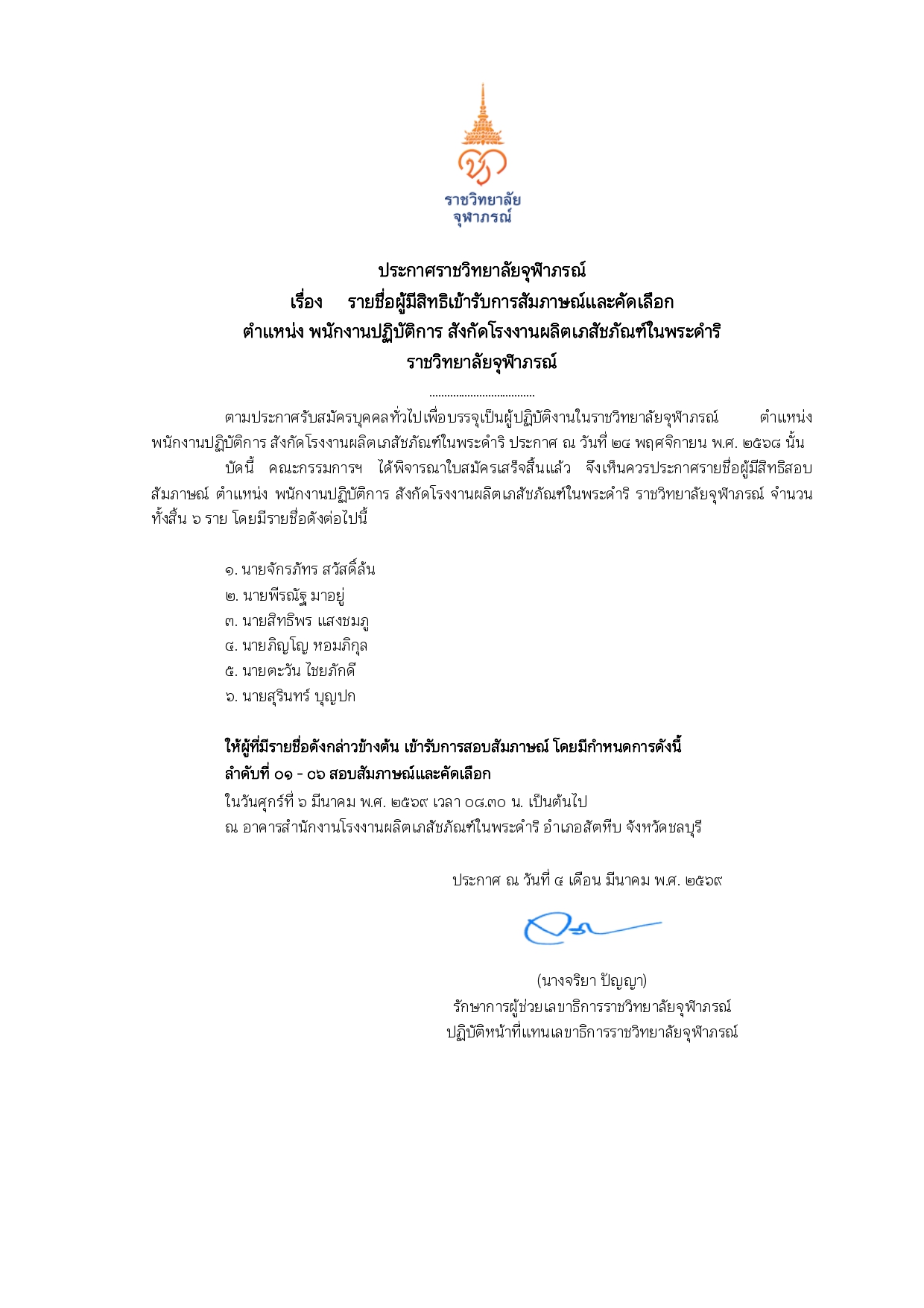 ประกาศรายชื่อผู้มีสิทธิเข้ารับการสัมภาษณ์และคัดเลือก ตำแหน่ง พนักงานปฏิบัติการ สังกัดโรงงานผลิตเภสัชภัณฑ์ในพระดำริ ราชวิทยาลัยจุฬาภรณ์