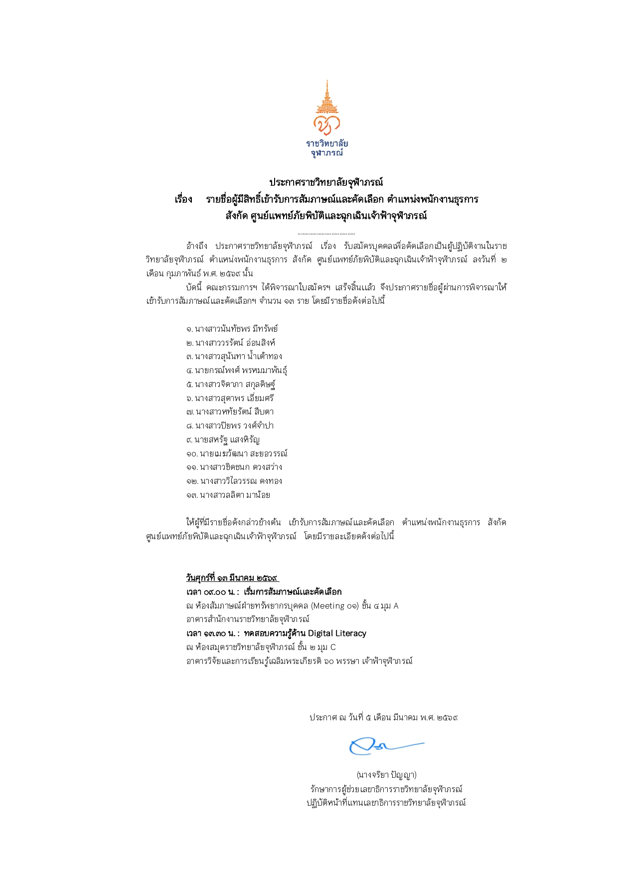 รายชื่อผู้มีสิทธิ์เข้ารับการสัมภาษณ์และคัดเลือก ตำแหน่งพนักงานธุรการ สังกัด ศูนย์แพทย์ภัยพิบัติและฉุกเฉินเจ้าฟ้าจุฬาภรณ์