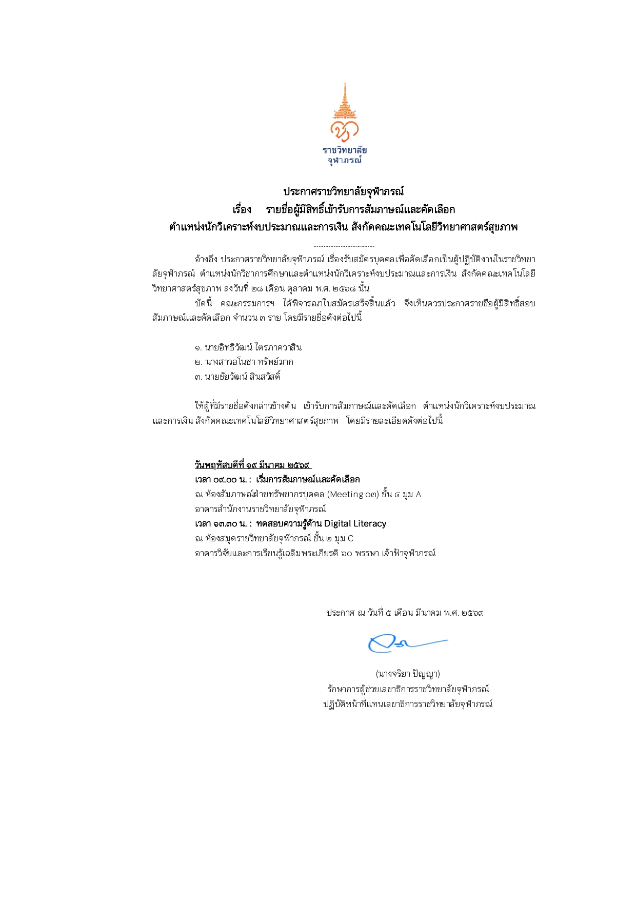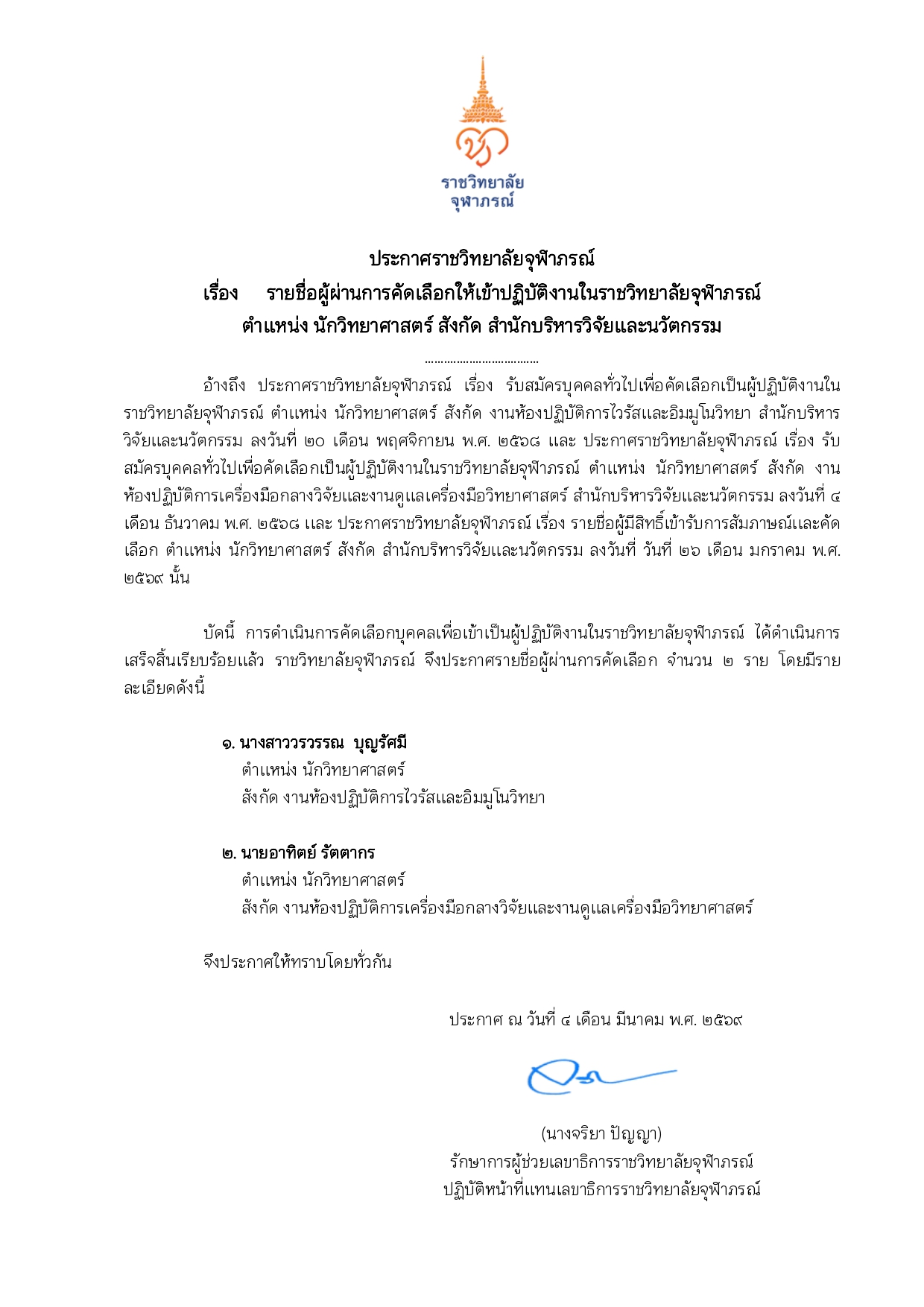 รายชื่อผู้ผ่านการคัดเลือกให้เข้าปฏิบัติงานในราชวิทยาลัยจุฬาภรณ์ ตำแหน่ง นักวิทยาศาสตร์ สังกัด สำนักบริหารวิจัยและนวัตกรรม