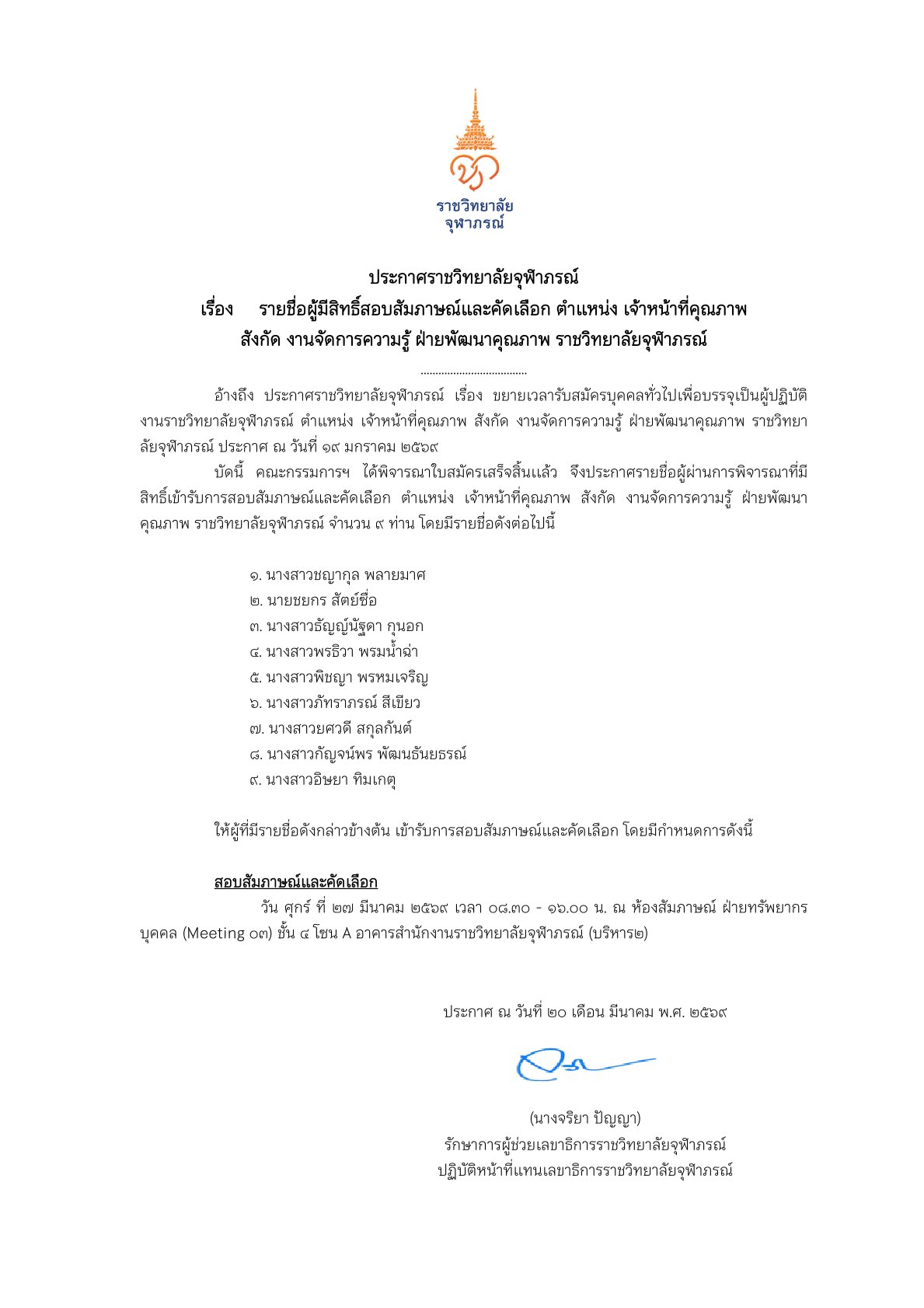 อ้างถึง ประกาศราชวิทยาลัยจุฬาภรณ์ เรื่อง รายชื่อผู้มีสิทธิ์เข้ารับการสัมภาษณ์เเละคัดเลือก...