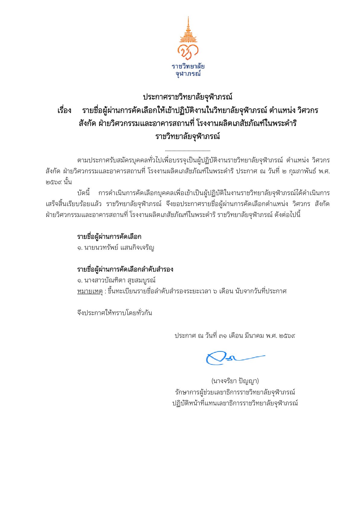 ตามประกาศรับสมัครบุคคลทั่วไปเพื่อบรรจุเป็นผู้ปฏิบัติงานในราชวิทยาลัยจุฬาภรณ์ ตำแหน่ง เภสัชกร (วิจัยแ...
