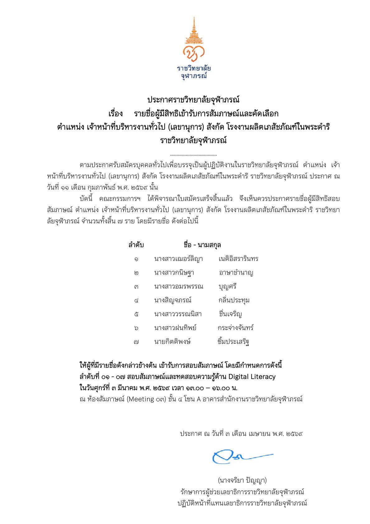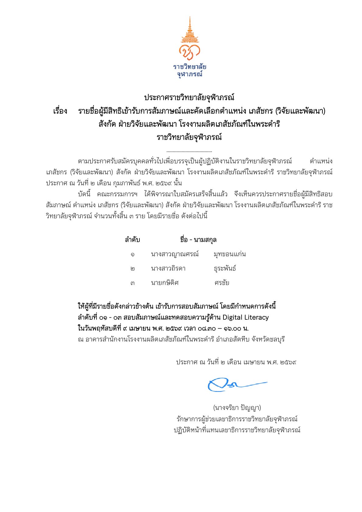ประกาศรายชื่อผู้มีสิทธิเข้ารับการสัมภาษณ์และคัดเลือก ตำแหน่ง เภสัชกร (วิจัยและพัฒนา) สังกัด ฝ่ายวิจัยและพัฒนา โรงงานผลิตเภสัชภัณฑ์ในพระดำริ ราชวิทยาลัยจุฬาภรณ์