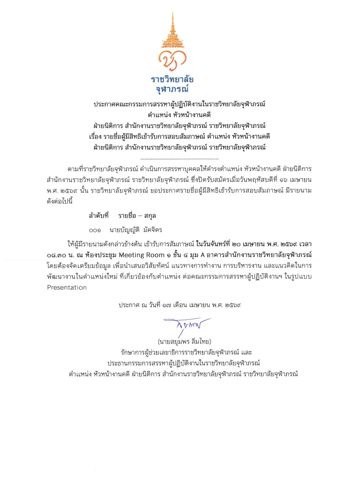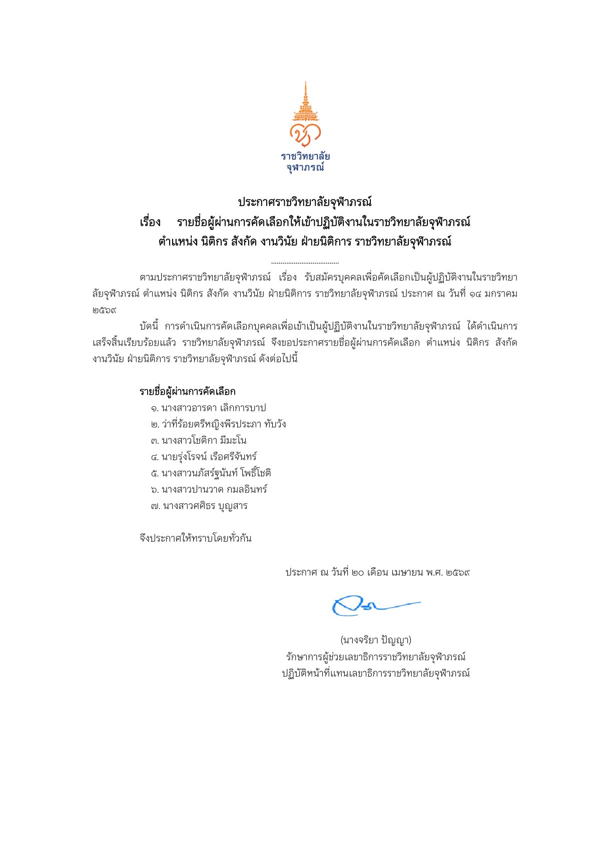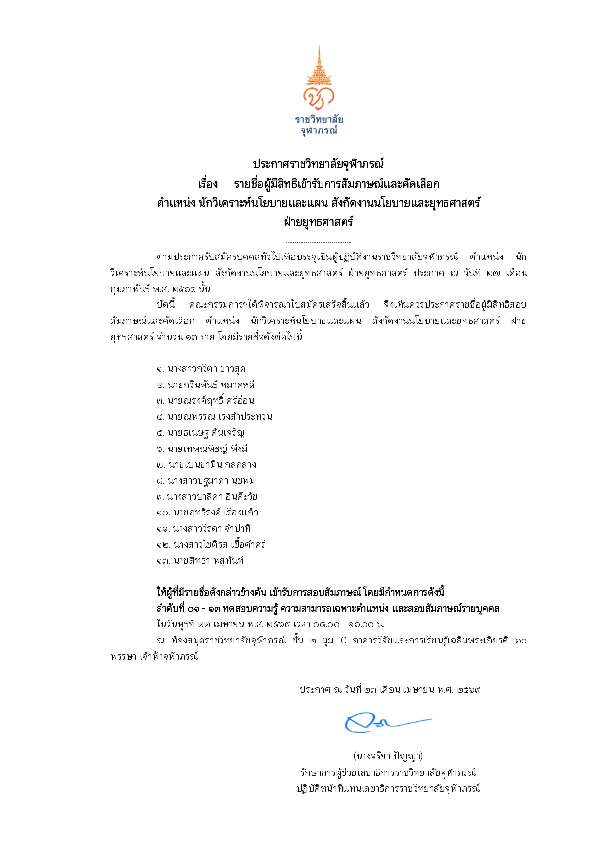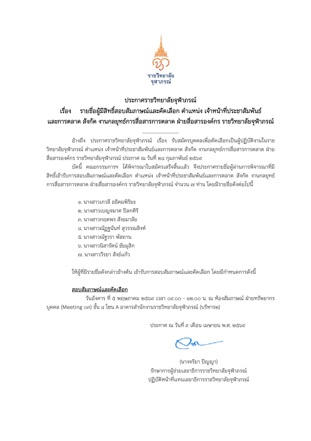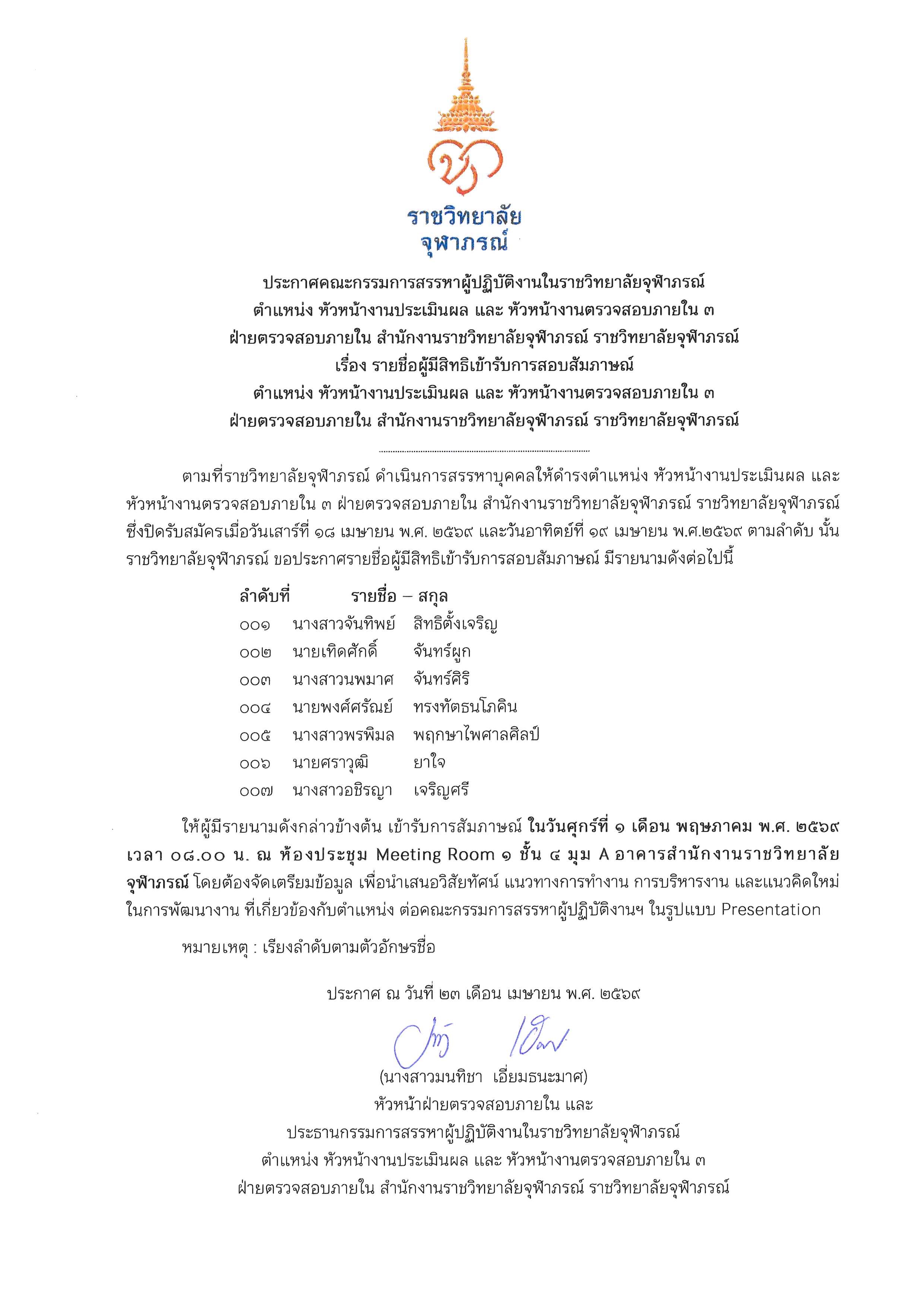 ประกาศรายชื่อผู้ผ่านการคัดเลือก ตำแหน่ง หัวหน้างานศึกษาศาสตร์และเส้นทางวิชาชีพ สำนักบริหารการศึกษาและบริการวิชาการ วิทยาลัยวิทยาศาสตร์การแพทย์เจ้าฟ้าจุฬาภรณ์