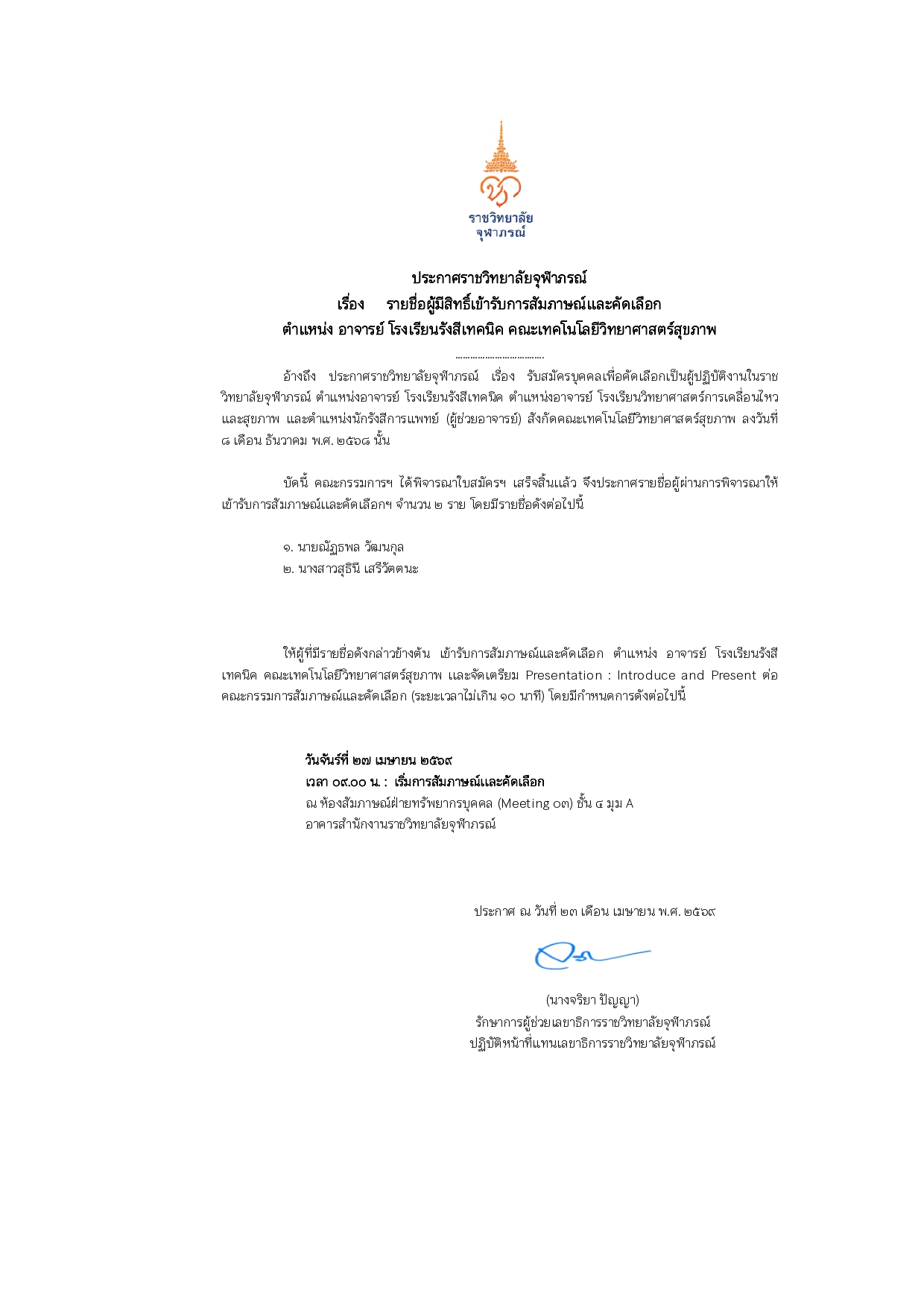 ประกาศรายชื่อผู้มีสิทธิ์สอบสัมภาษณ์และคัดเลือก ตำแหน่ง เจ้าหน้าที่ประชาสัมพันธ์และการตลาด สังกัด งานกลยุทธ์การสื่อสารการตลาด ฝ่ายสื่อสารองค์กร ราชวิทยาลัยจุฬาภรณ์ ณ วันที่ ๐๙/๐๔/๒๕๖๘