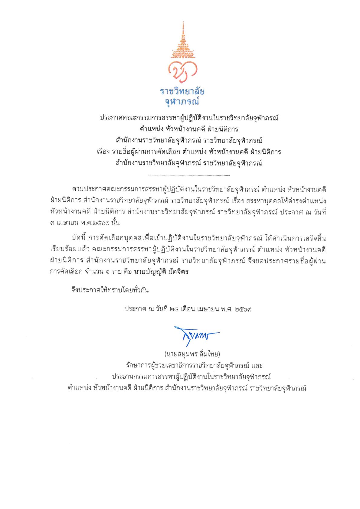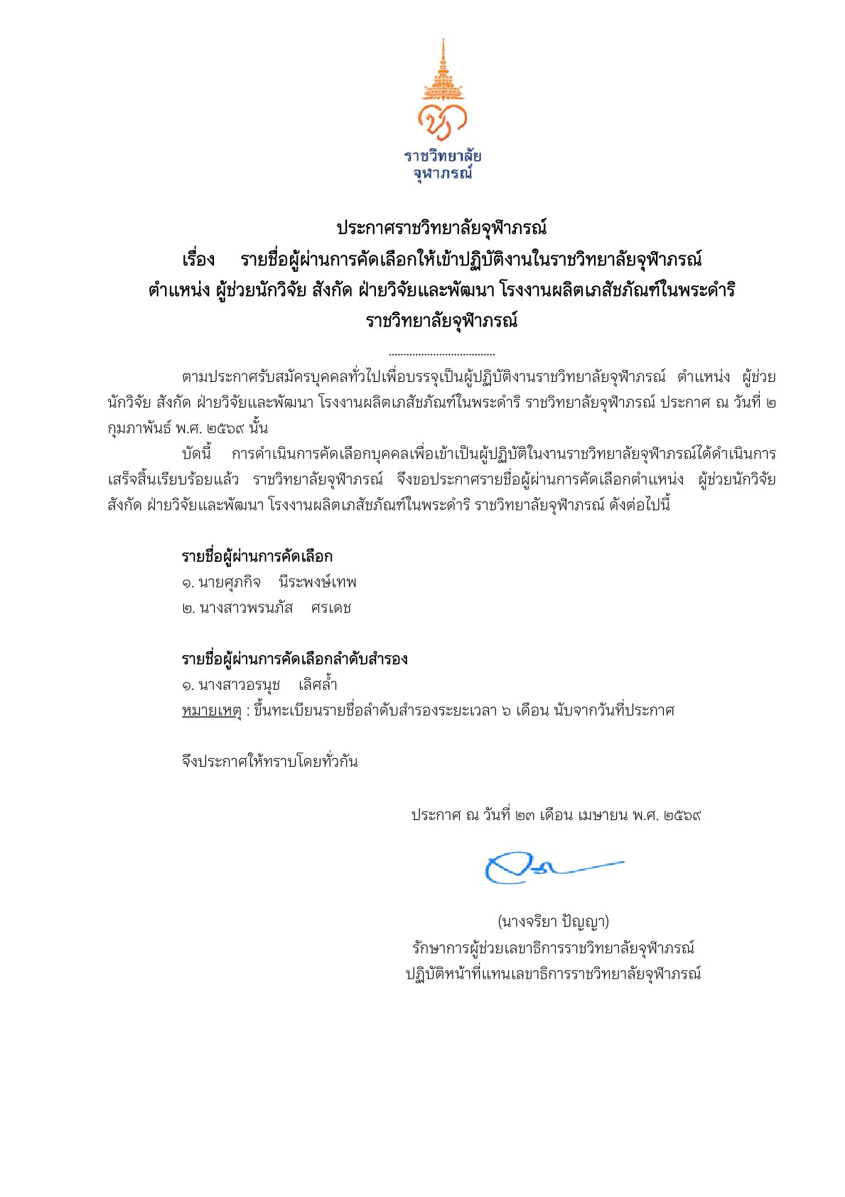 อ้างถึง ประกาศราชวิทยาลัยจุฬาภรณ์ เรื่อง รับสมัครบุคคลเพื่อคัดเลือกเป็นผู้ปฏิบัติงานในราชวิทยาล...