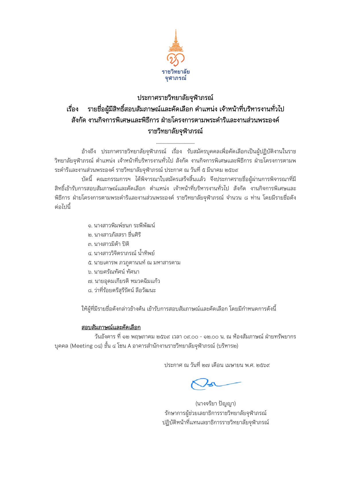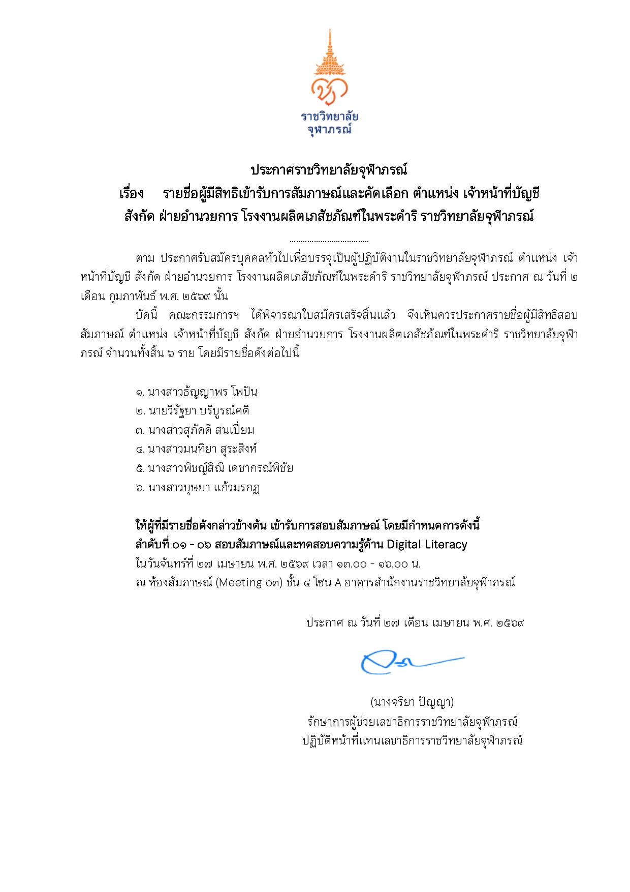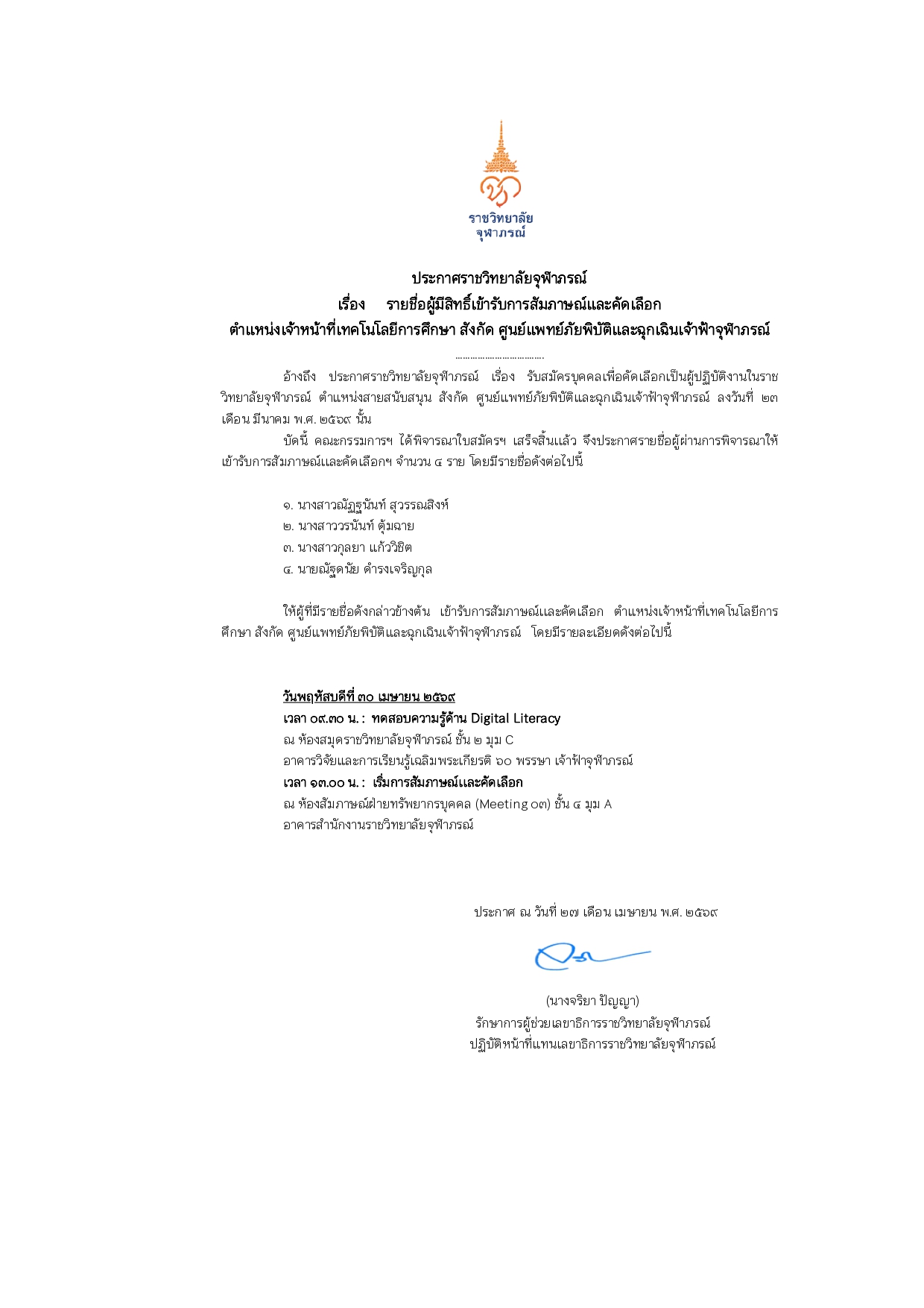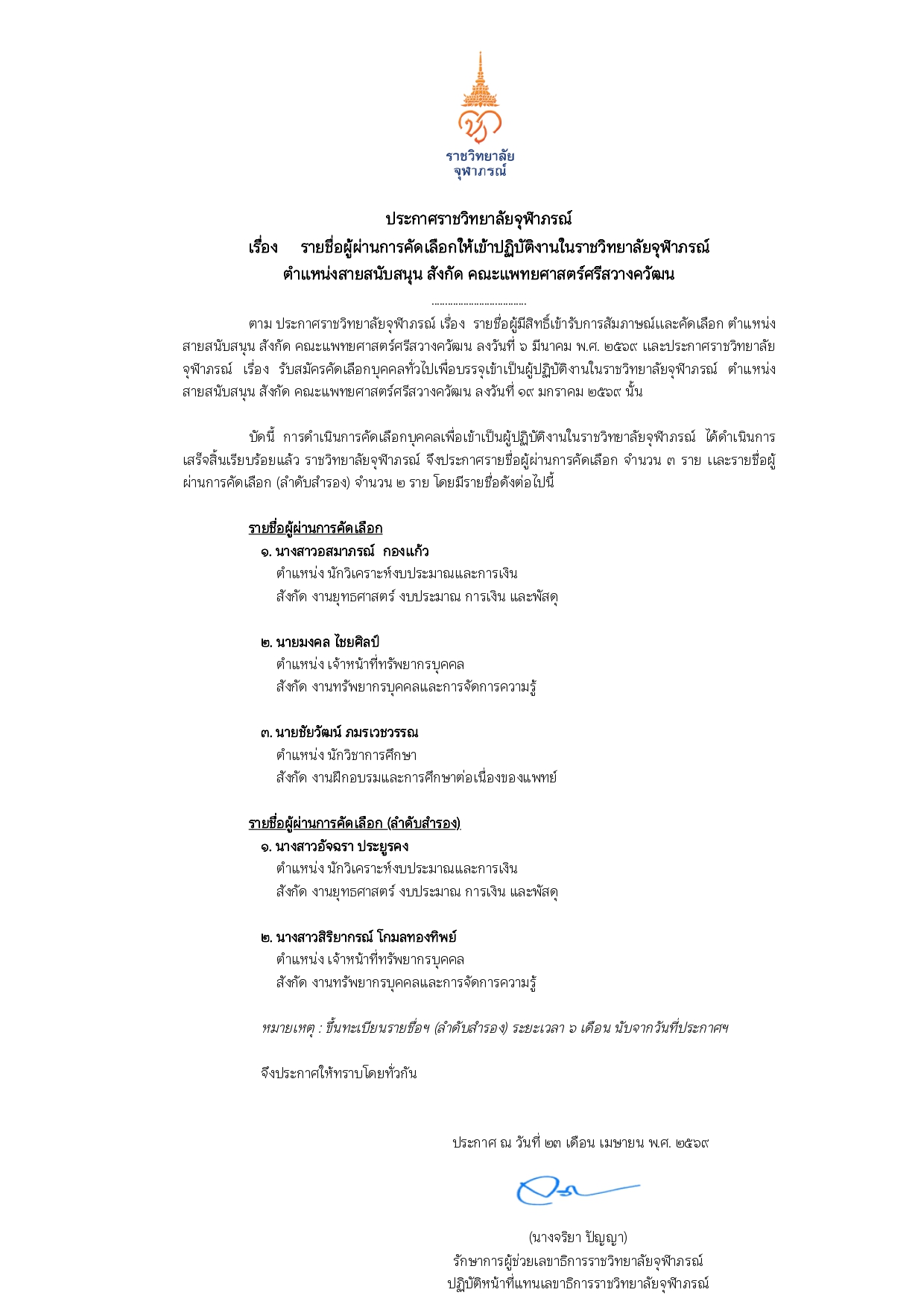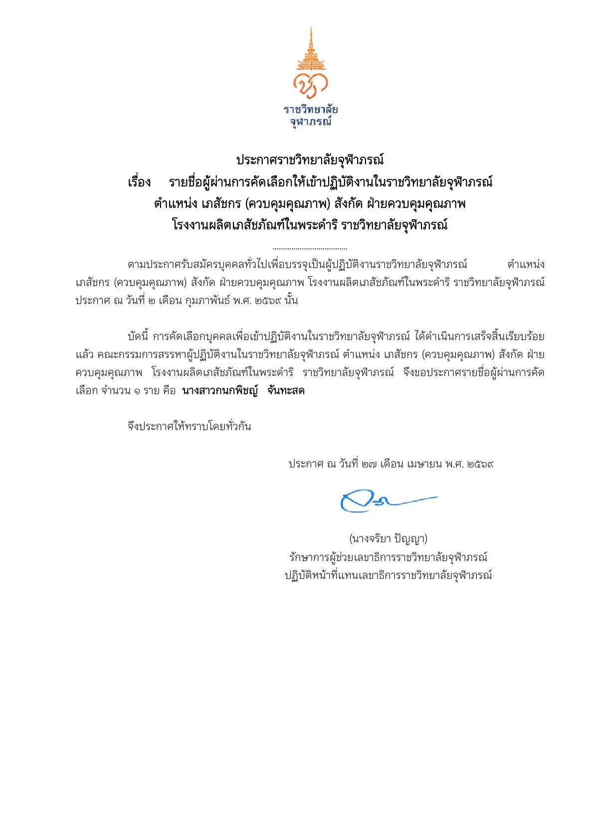 ประกาศรายชื่อผู้ผ่านการคัดเลือกให้เข้าปฏิบัติงานในราชวิทยาลัยจุฬาภรณ์ ตำแหน่ง ผู้ช่วยนักวิจัย สังกัด ฝ่ายวิจัยและพัฒนา โรงงานผลิตเภสัชภัณฑ์ในพระดำริ ราชวิทยาลัยจุฬาภรณ์