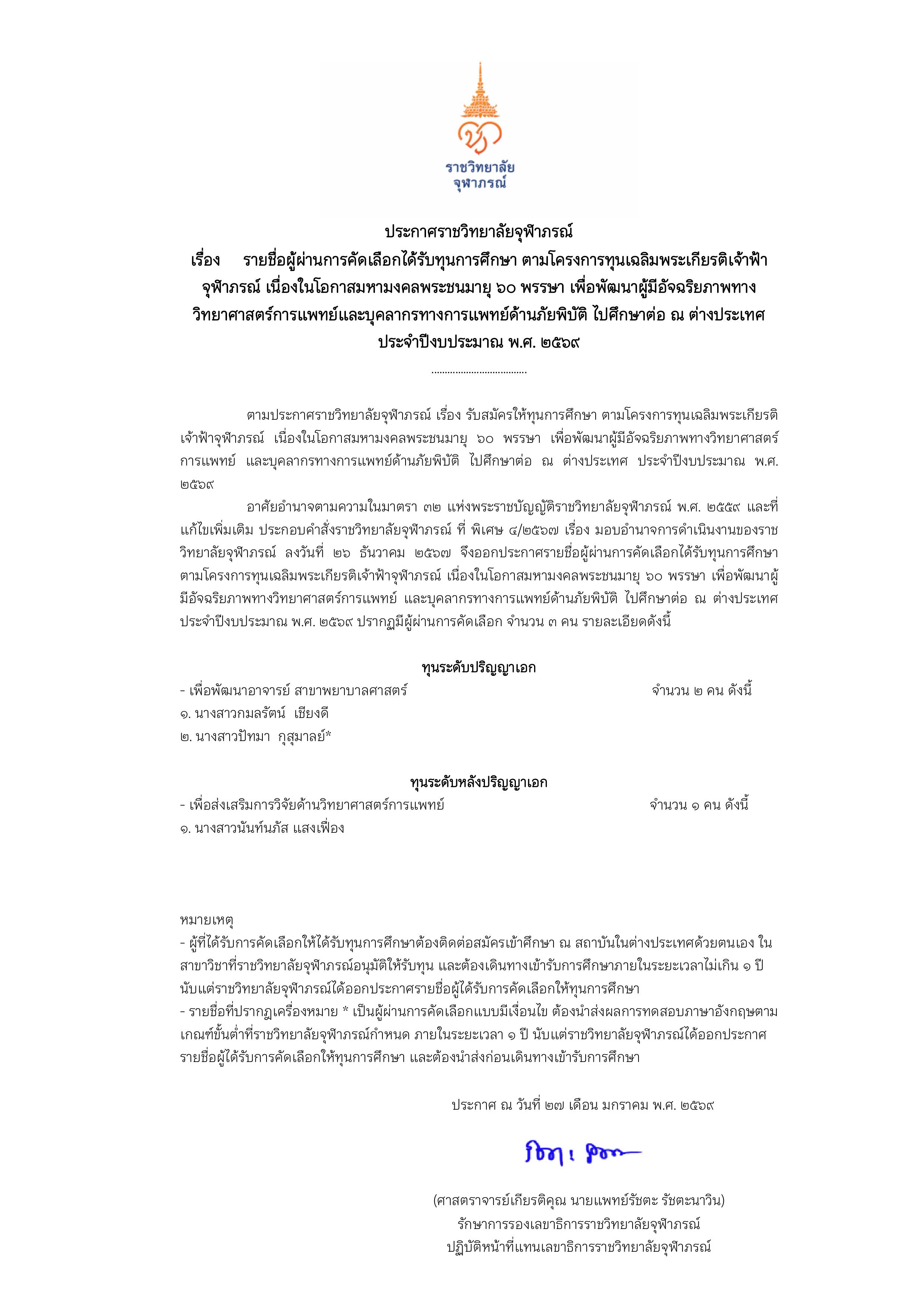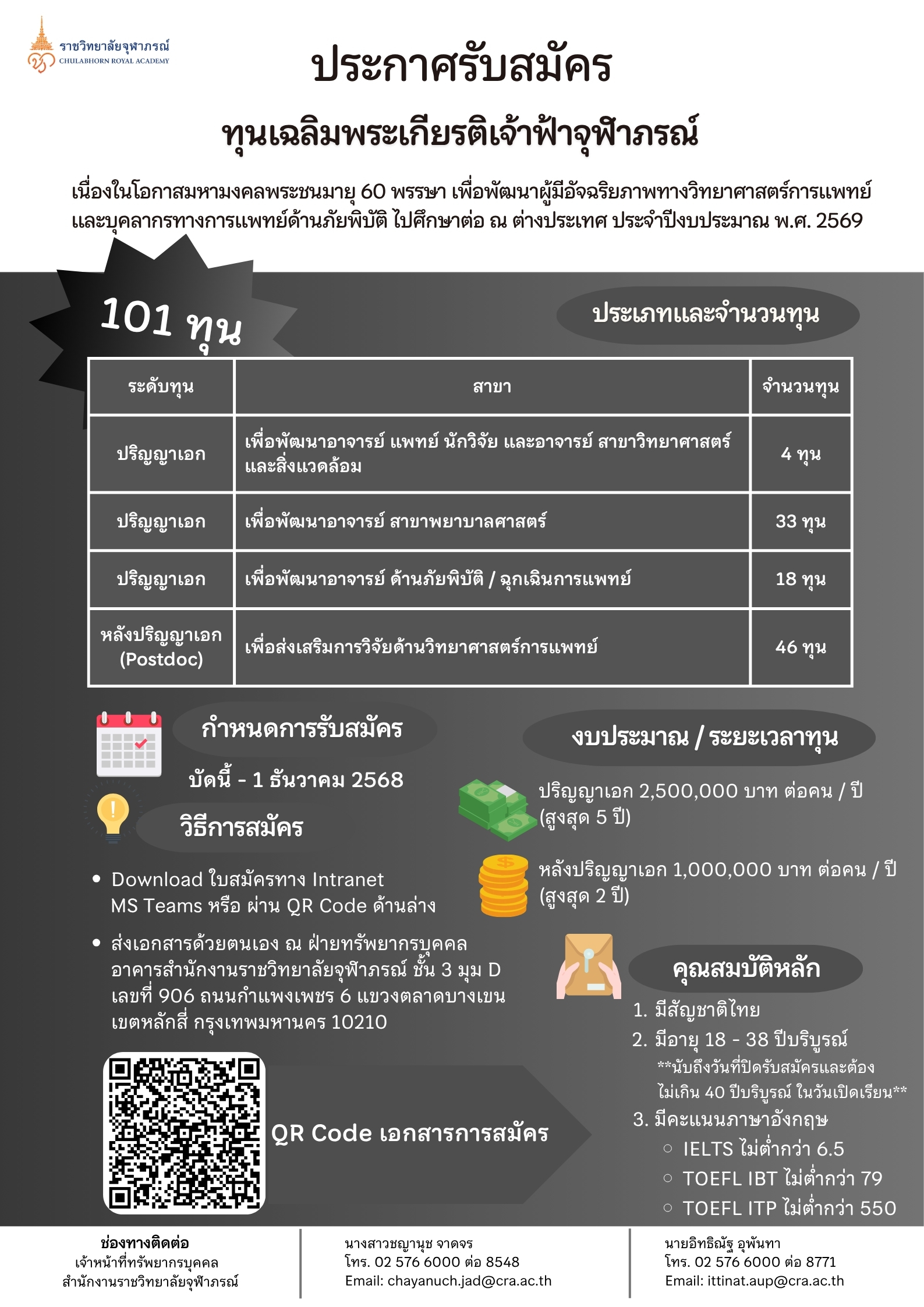 เปิดรับสมัคร ทุนเฉลิมพระเกียรติ เจ้าฟ้าจุฬาภรณ์ เนื่องในโอกาสมหามงคลพระชนมายุ 60 พรรษา เพื่อพัฒนาผู้มีอัจฉริยภาพทางวิทยาศาสตร์การแพทย์ และบุคลากรทางการแพทย์ด้านภัยพิบัติ ศึกษาต่อ ณ ต่างประเทศ ประจำปีงบประมาณ พ.ศ. 2569