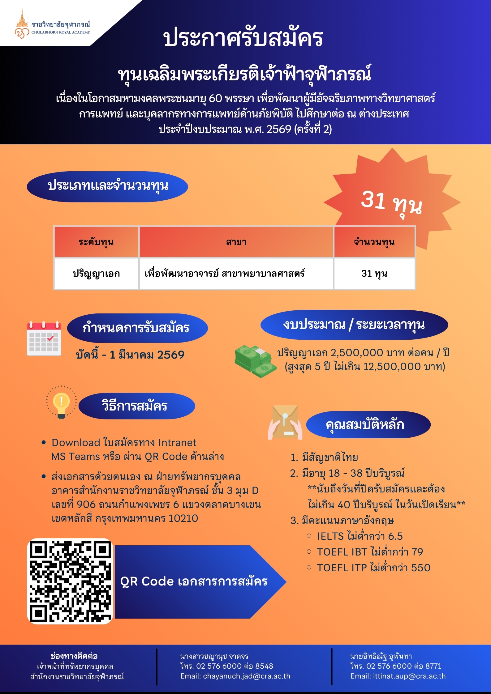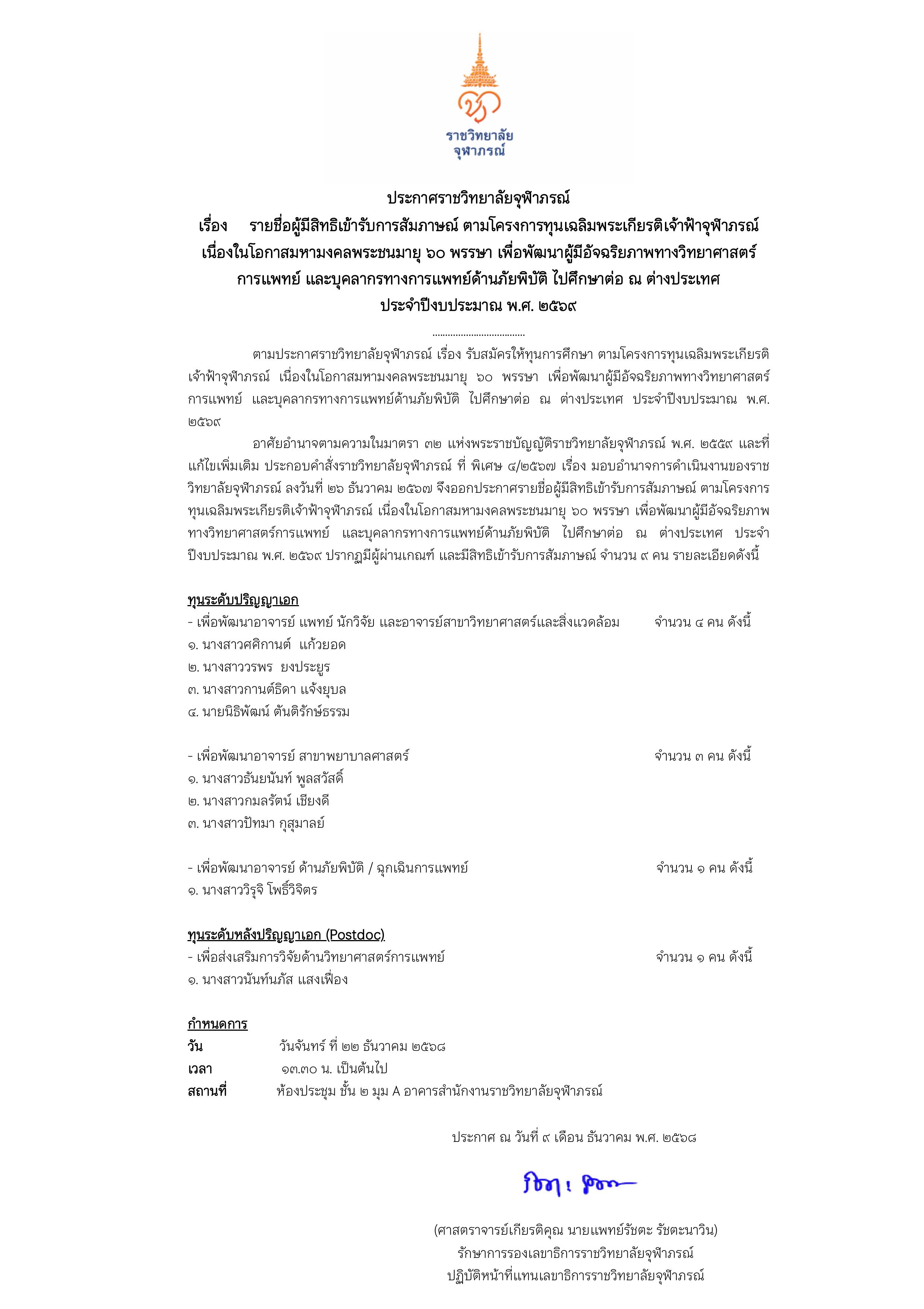 เปิดรับสมัคร ทุนเฉลิมพระเกียรติ เจ้าฟ้าจุฬาภรณ์ เนื่องในโอกาสมหามงคลพระชนมายุ 60 พรรษา เพื่อพัฒนาผู้มีอัจฉริยภาพทางวิทยาศาสตร์การแพทย์ และบุคลากรทางการแพทย์ด้านภัยพิบัติ ศึกษาต่อ ณ ต่างประเทศ ประจำปีงบประมาณ พ.ศ. 2569