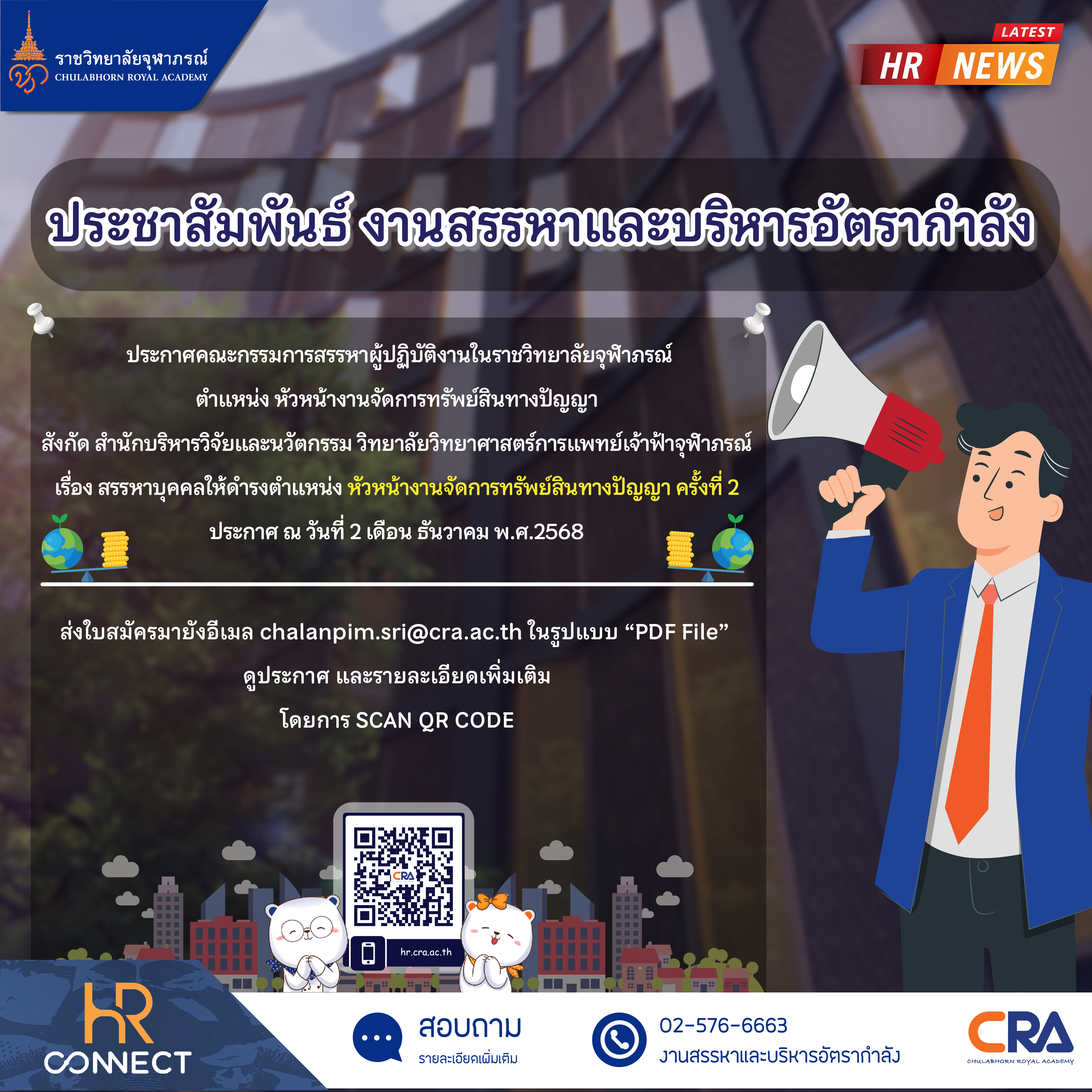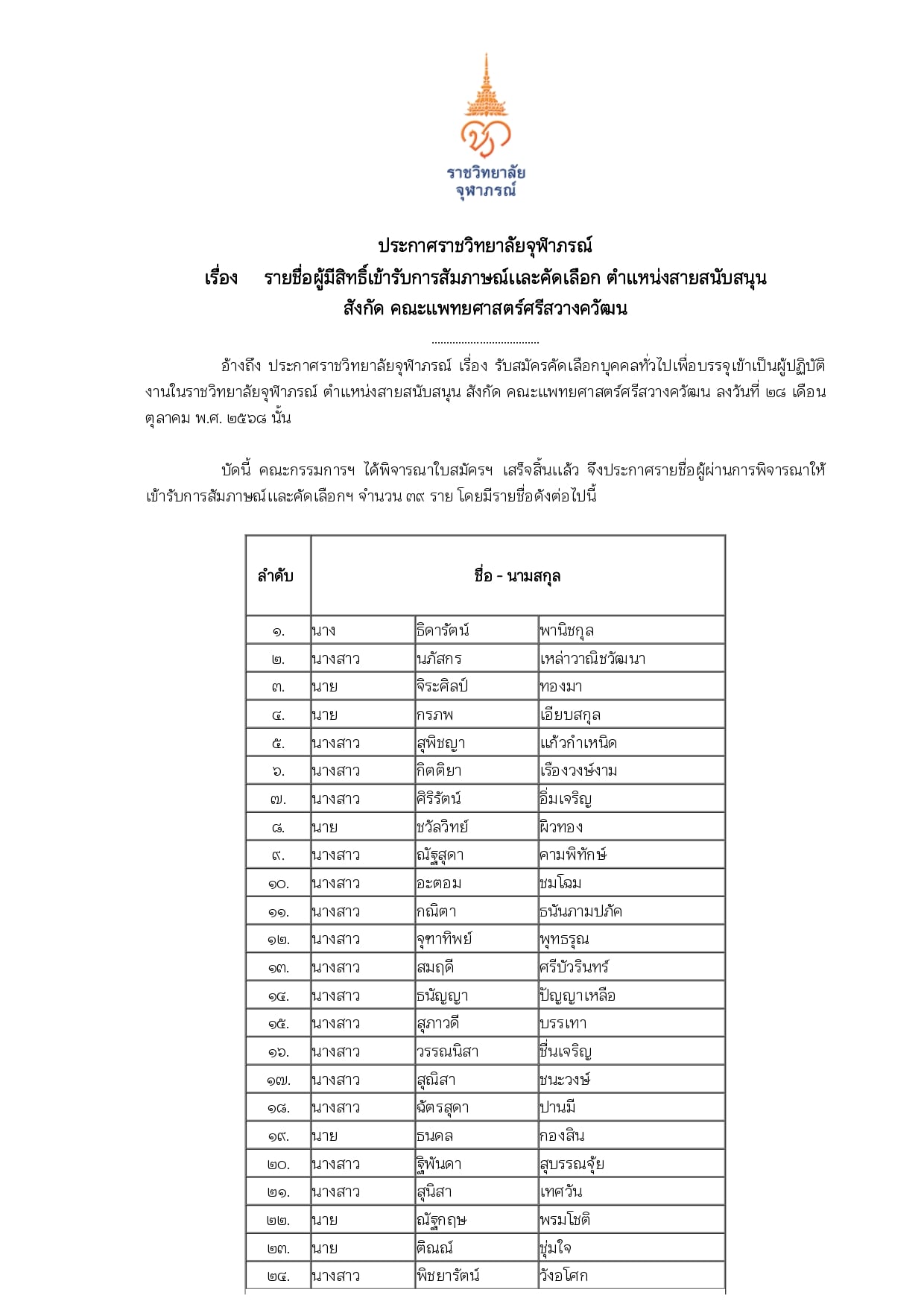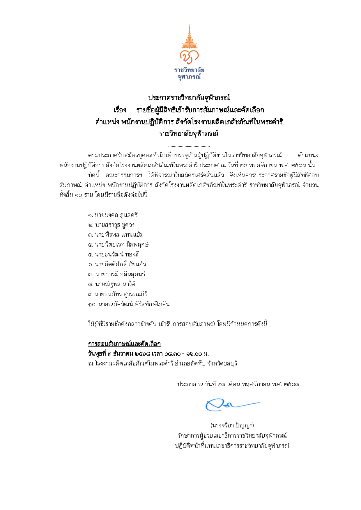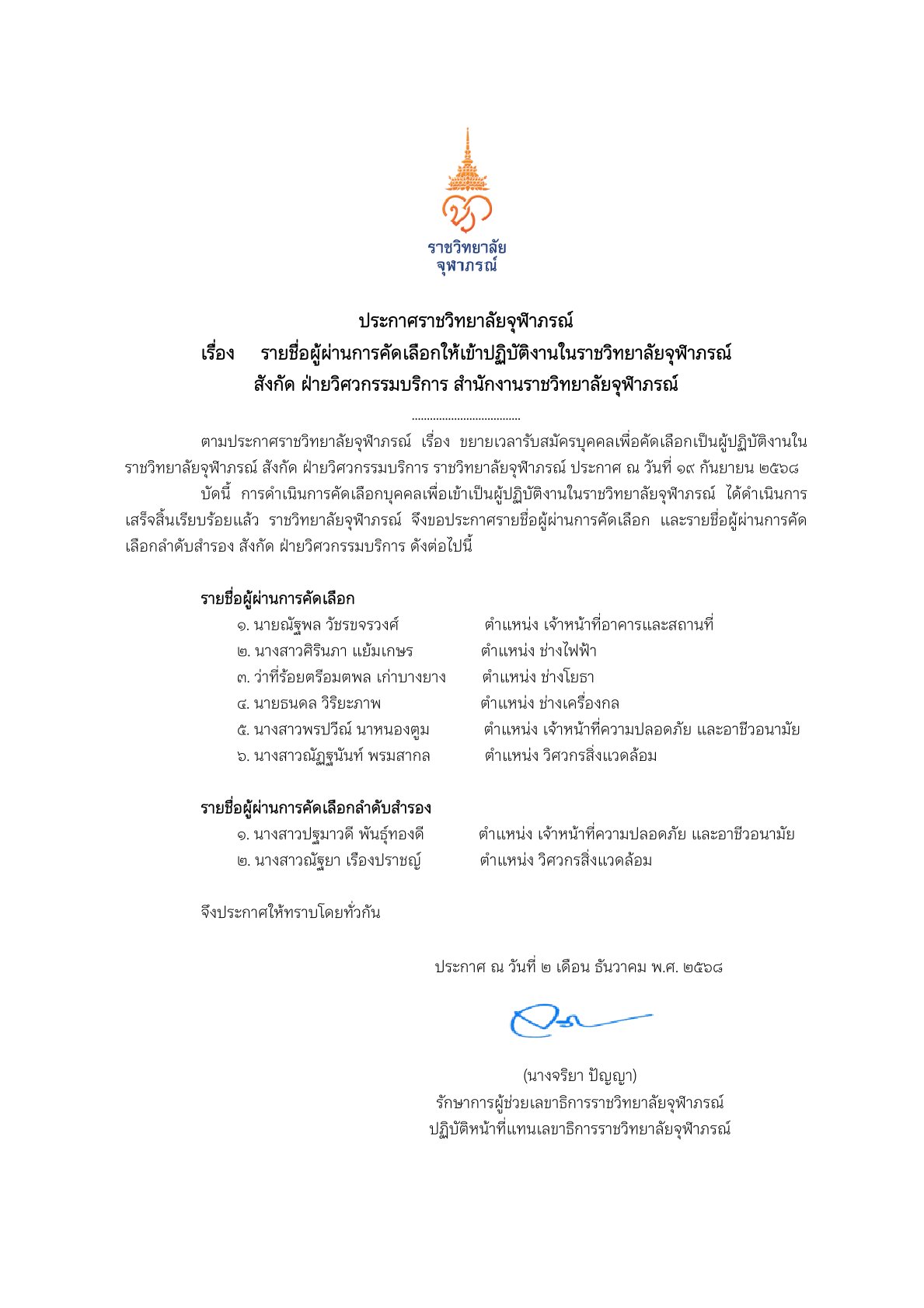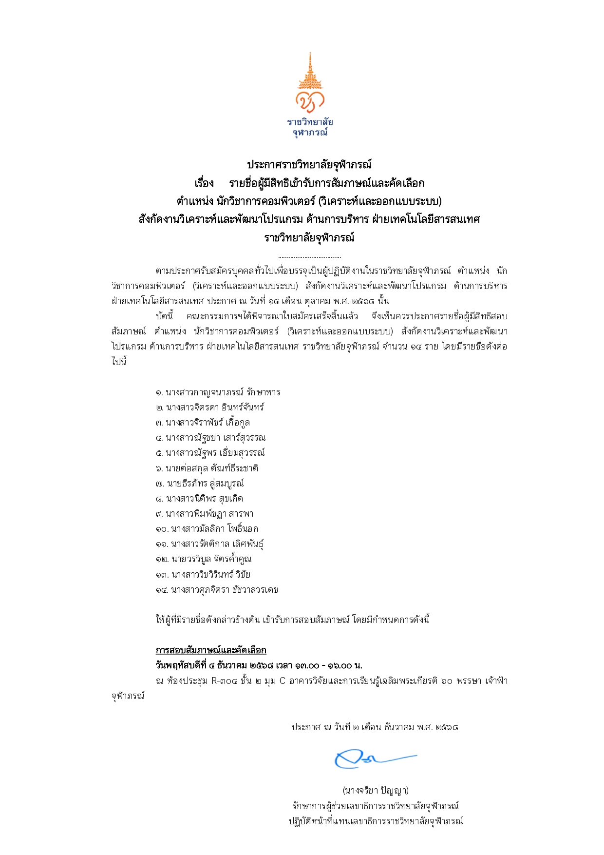 ตามประกาศรับสมัครบุคคลทั่วไปเพื่อบรรจุเป็นผู้ปฏิบัติงานในราชวิทยาลัยจุฬาภรณ์ ตำแหน่ง นักวิชาการคอมพิ...