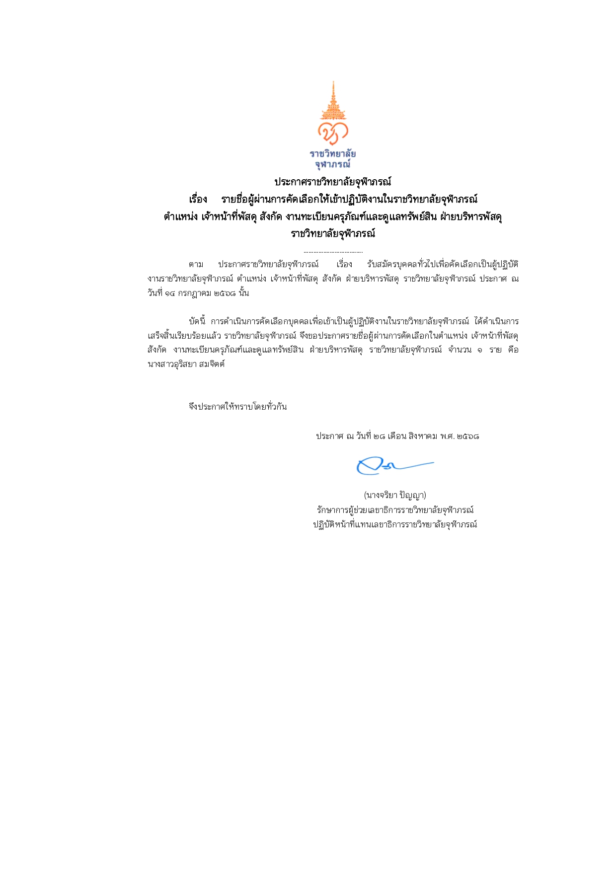 รายชื่อผู้ผ่านการคัดเลือกให้เข้าปฏิบัติงานในราชวิทยาลัยจุฬาภรณ์ สังกัด สำนักบริหารการศึกษาและบริการวิชาการ วิทยาลัยวิทยาศาสตร์การแพทย์เจ้าฟ้าจุฬาภรณ์ ณ วันที่ ๑๒/๐๙/๖๘