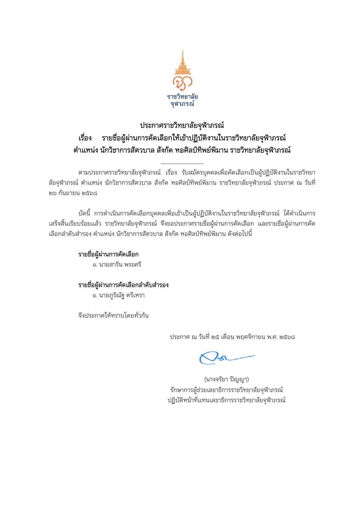 ประกาศรายชื่อผู้ผ่านการคัดเลือกให้เข้าปฏิบัติงานในราชวิทยาลัยจุฬาภรณ์ ตำแหน่ง นักวิชาการสัตวบาล สังกัด หอศิลป์ทิพย์พิมาน ณ วันที่ ๒๕/๑๑/๒๕๖๘