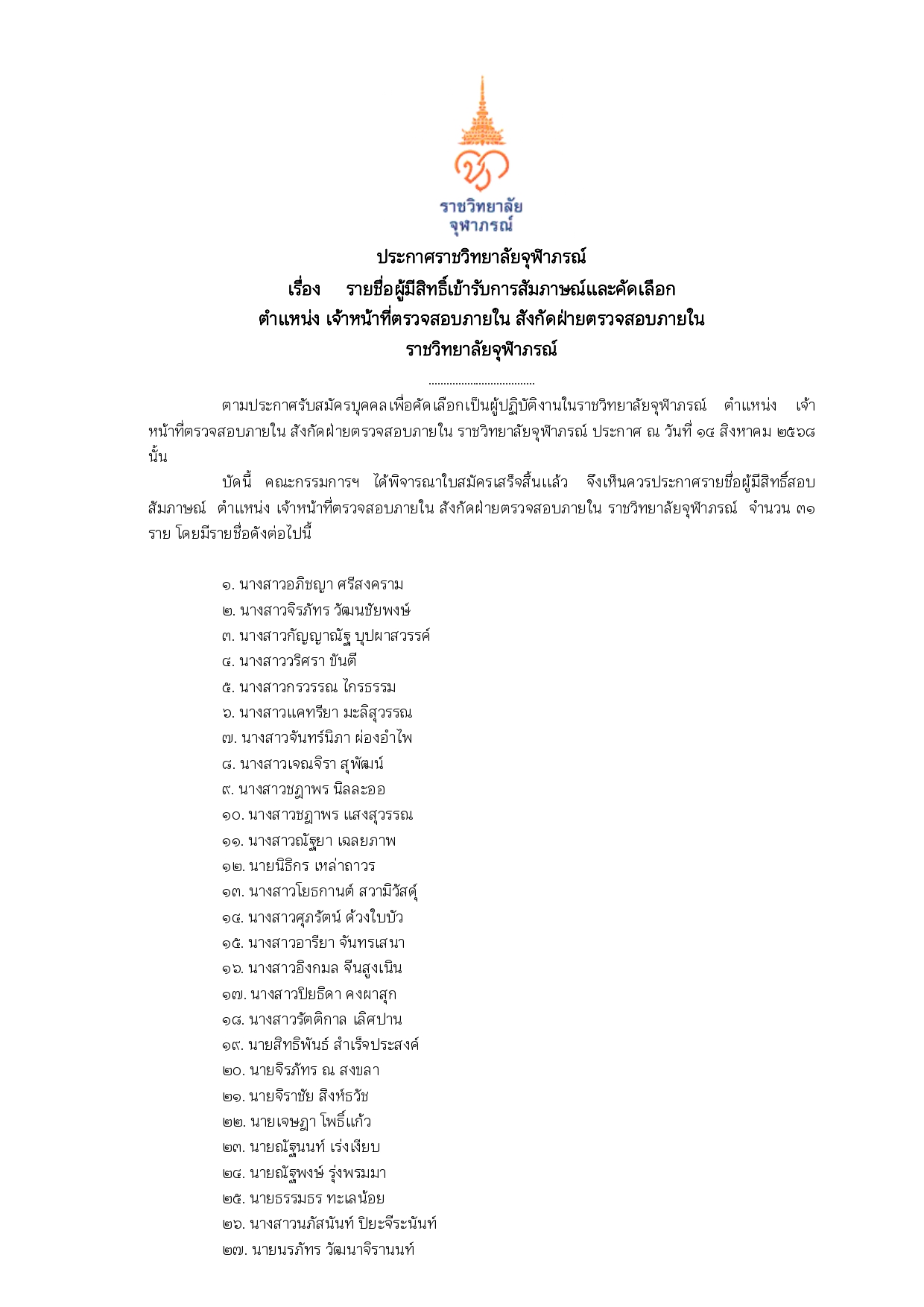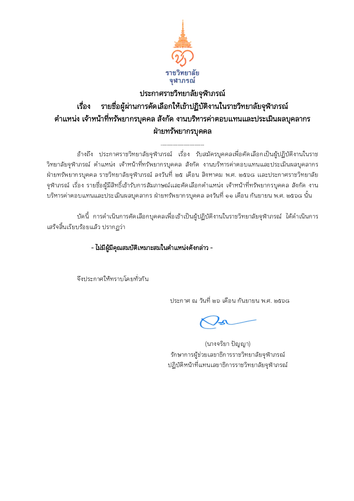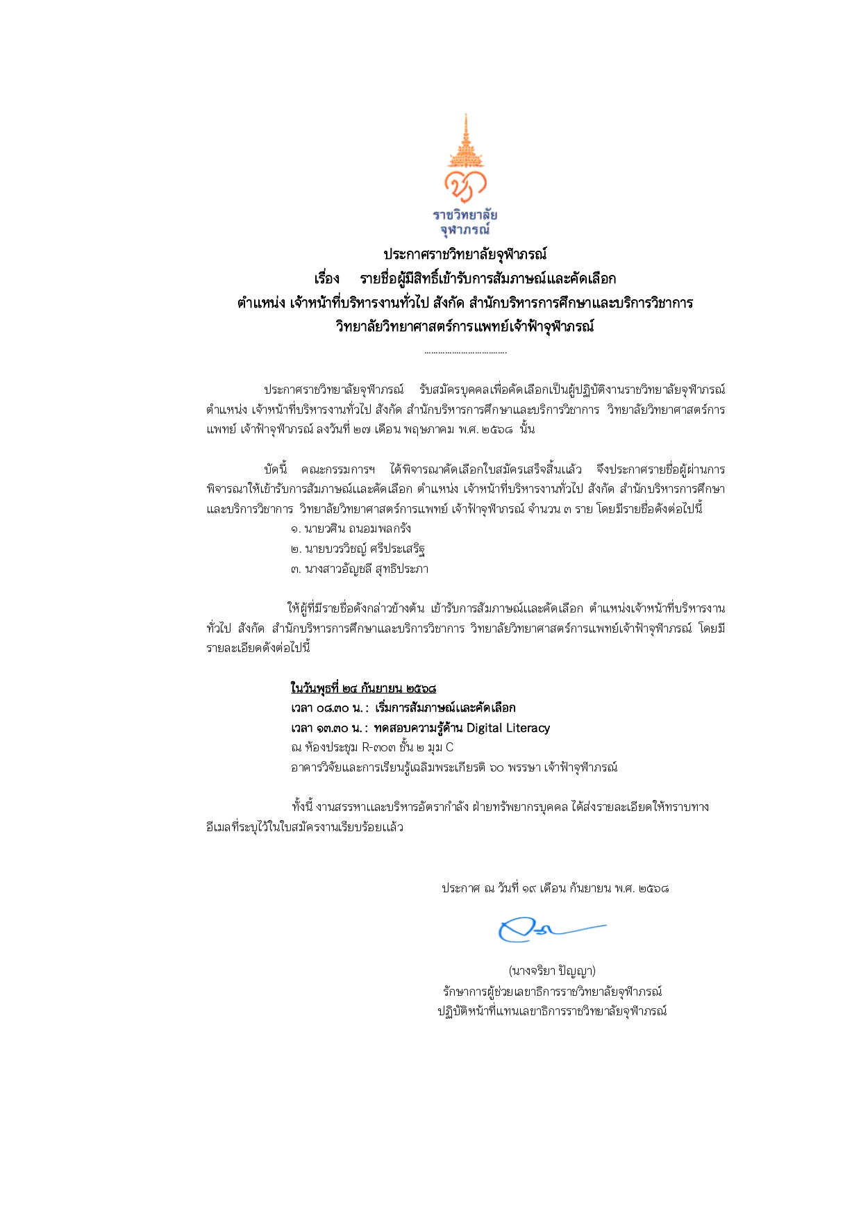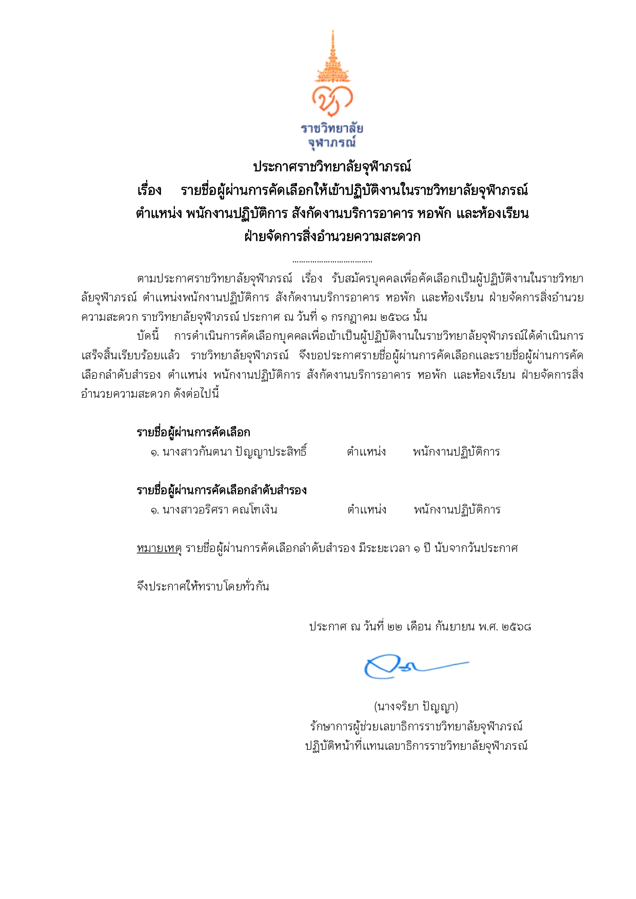 ประกาศรายชื่อผู้ผ่านการคัดเลือกให้เข้าปฏิบัติงานในราชวิทยาลัยจุฬาภรณ์ ตำแหน่ง พนักงานปฏิบัติการ สังกัดงานบริการอาคาร หอพัก และห้องเรียน ฝ่ายจัดการสิ่งอำนวยความสะดวก ณ วันที่ ๒๒/๐๙/๒๕๖๘