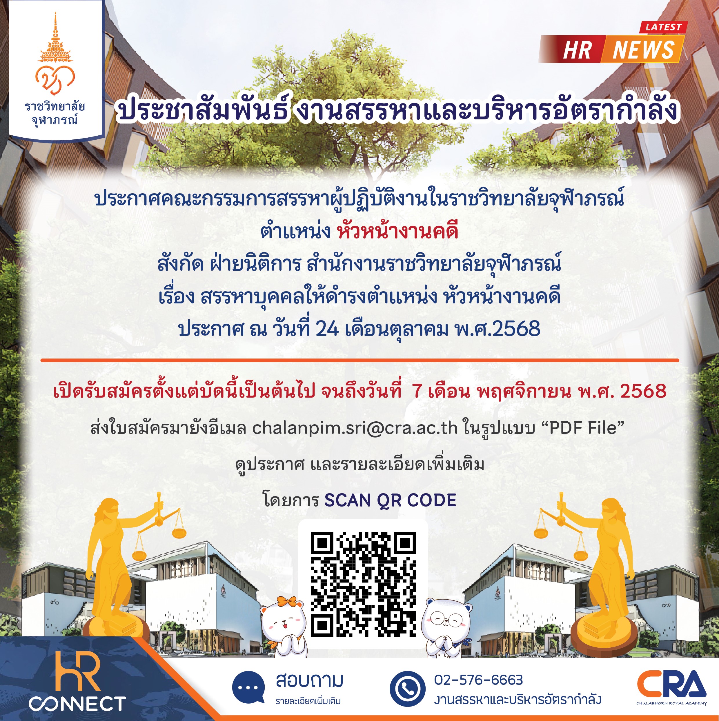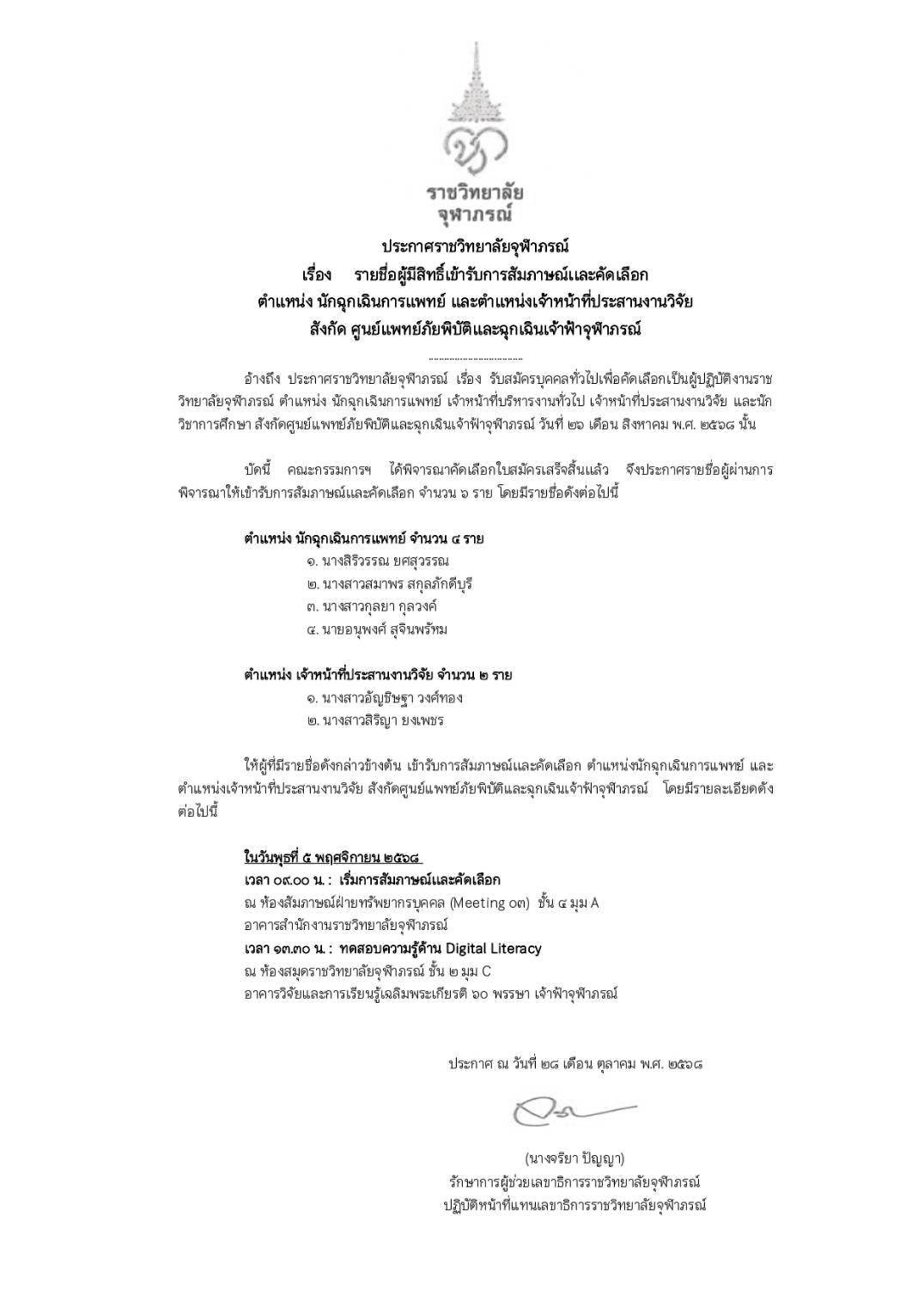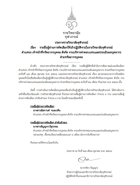 ประกาศรายชื่อผู้ผ่านการคัดเลือกให้เข้าปฏิบัติงานในราชวิทยาลัยจุฬาภรณ์ ตำแหน่ง พยาบาลวิชาชีพ ผู้ช่วยพยาบาล และพนักงานธุรการ สังกัด ฝ่ายการพยาบาล โรงพยาบาลจุฬาภรณ์ ณ วันที่ 31/10/2568