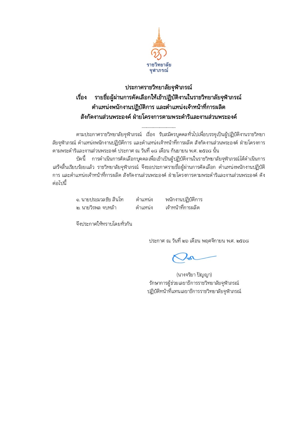 ประกาศรายชื่อผู้ผ่านการคัดเลือกให้เข้าปฏิบัติงานในราชวิทยาลัยจุฬาภรณ์ ตำแหน่งพนักงานปฏิบัติการ และตำแหน่งเจ้าหน้าที่การผลิต สังกัดงานส่วนพระองค์ ฝ่ายโครงการตามพระดำริและงานส่วนพระองค์