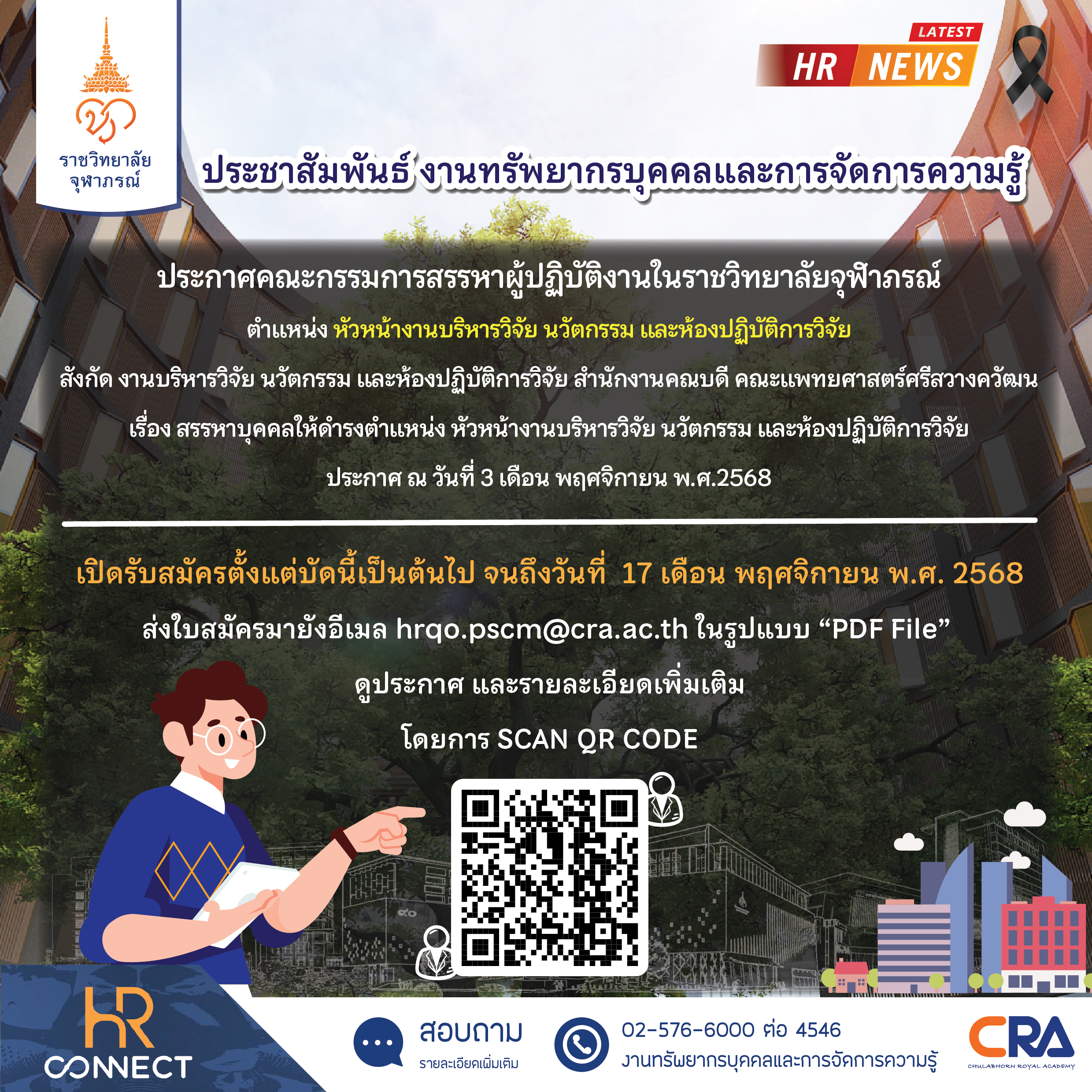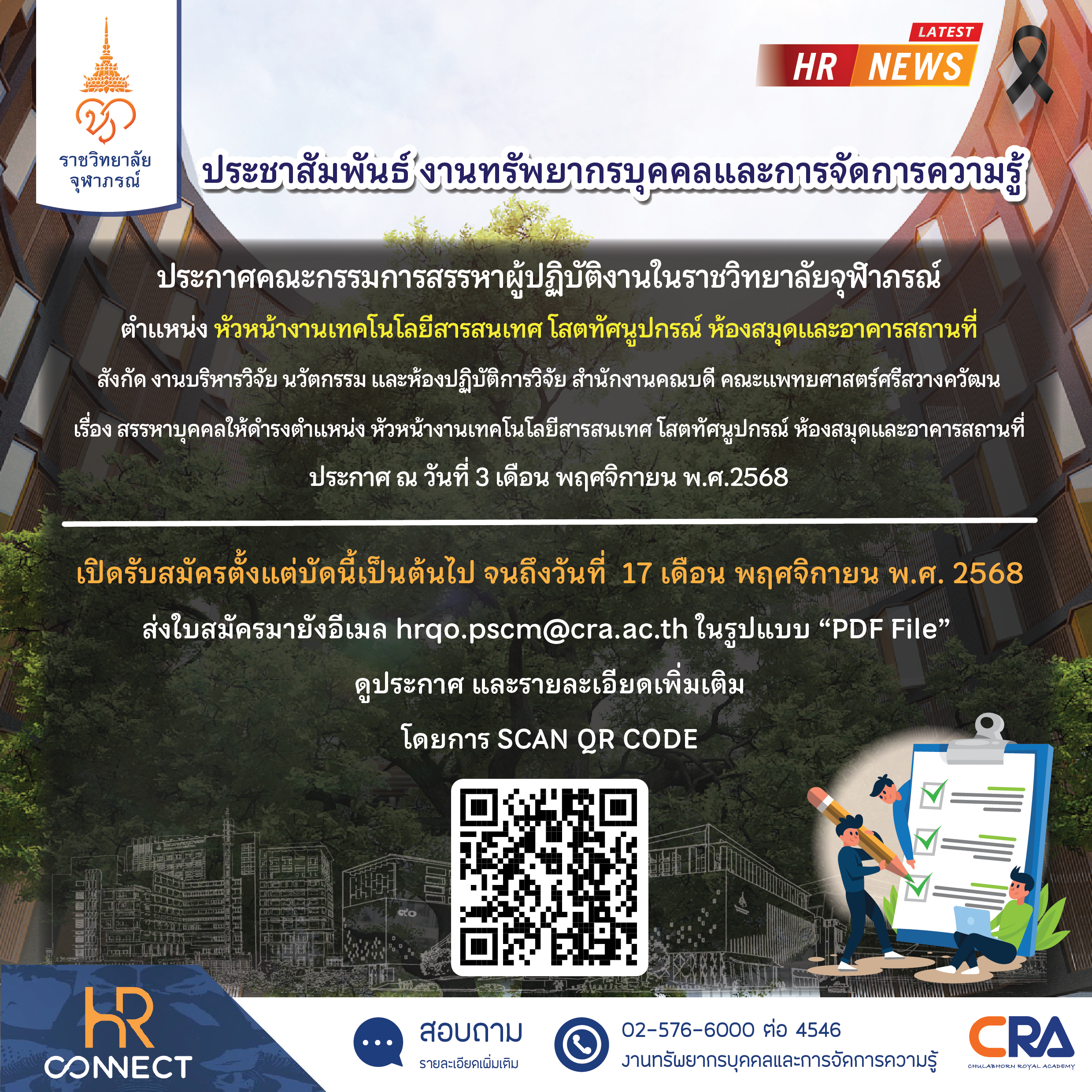 ประกาศคณะกรรมการสรรหาผู้ปฏิบัติงานในราชวิทยาลัยจุฬาภรณ์ตำแหน่ง หัวหน้างานเทคโนโลยีสารสนเทศ โสตทัศนูป...