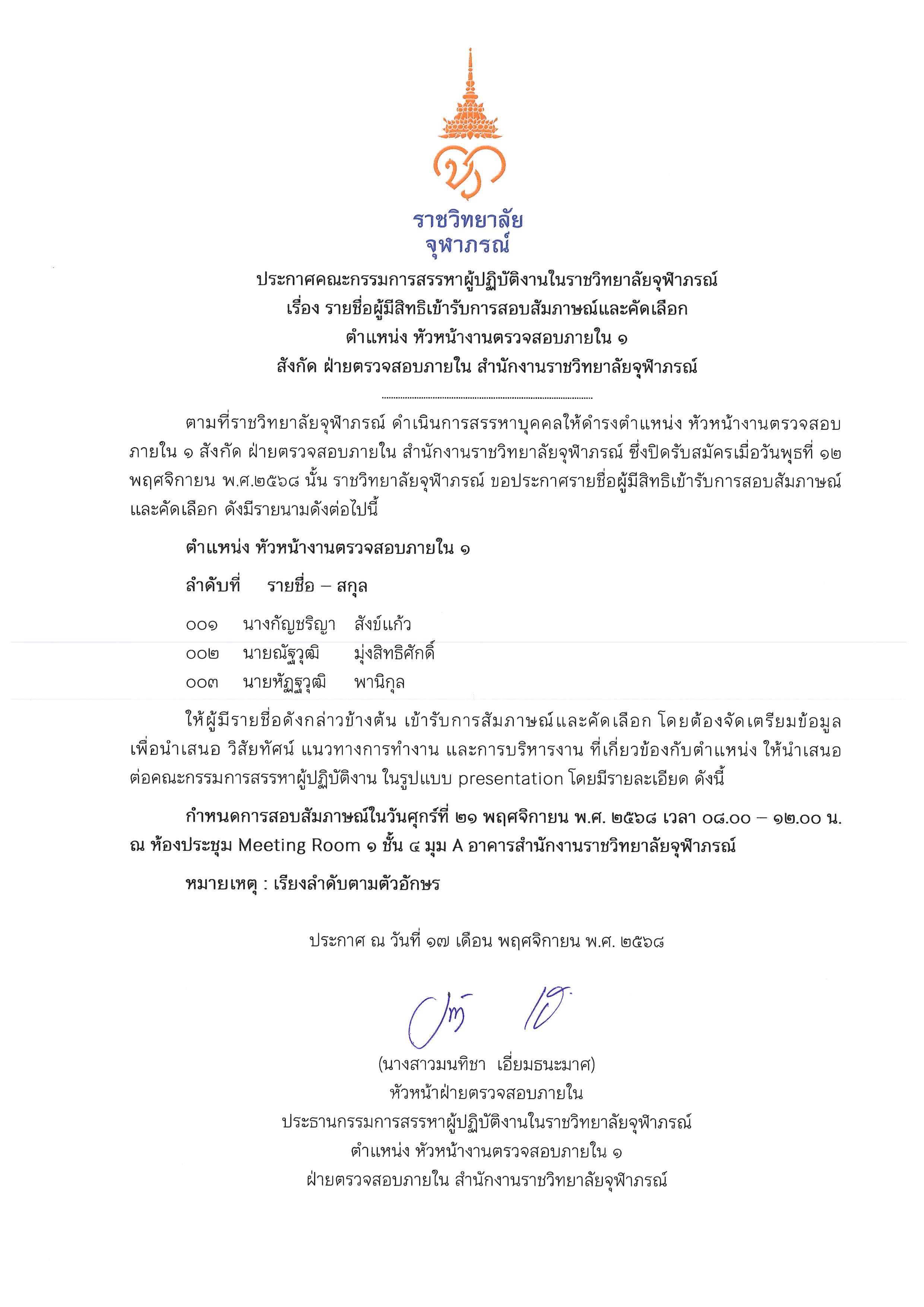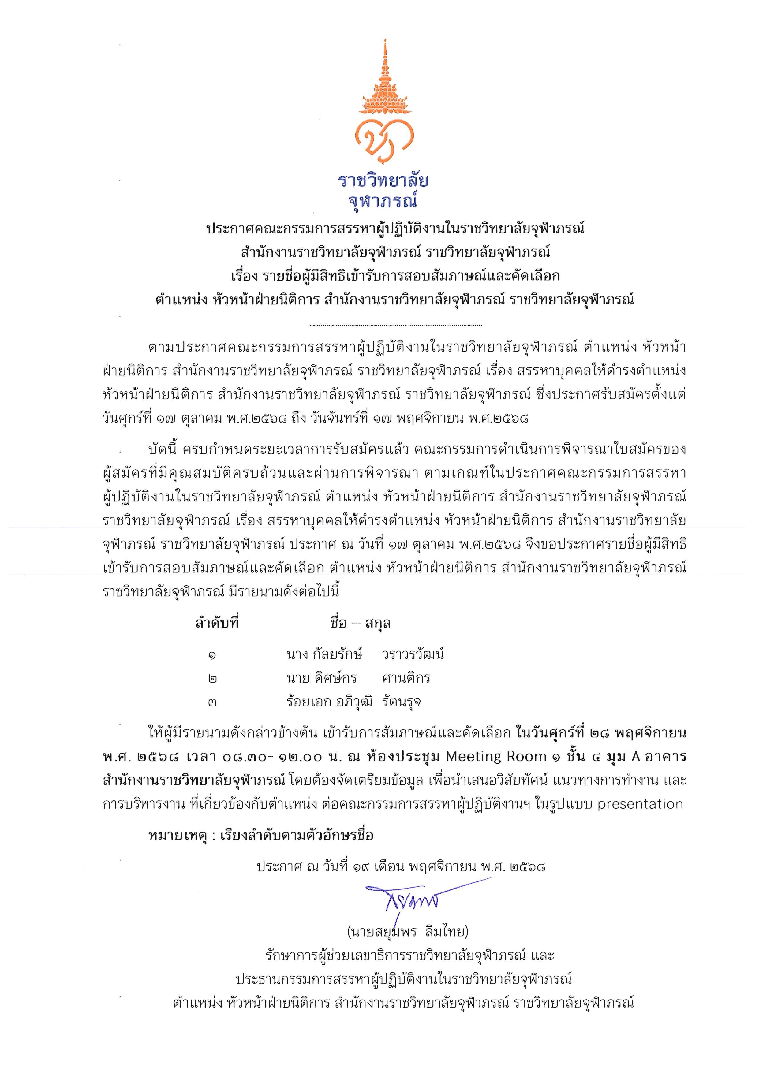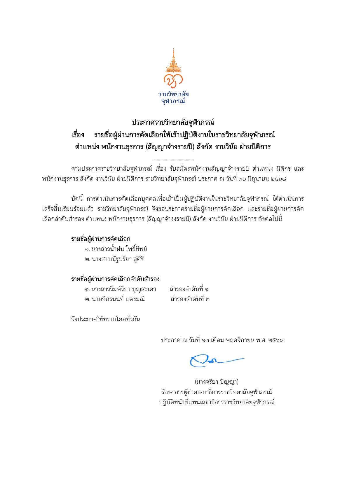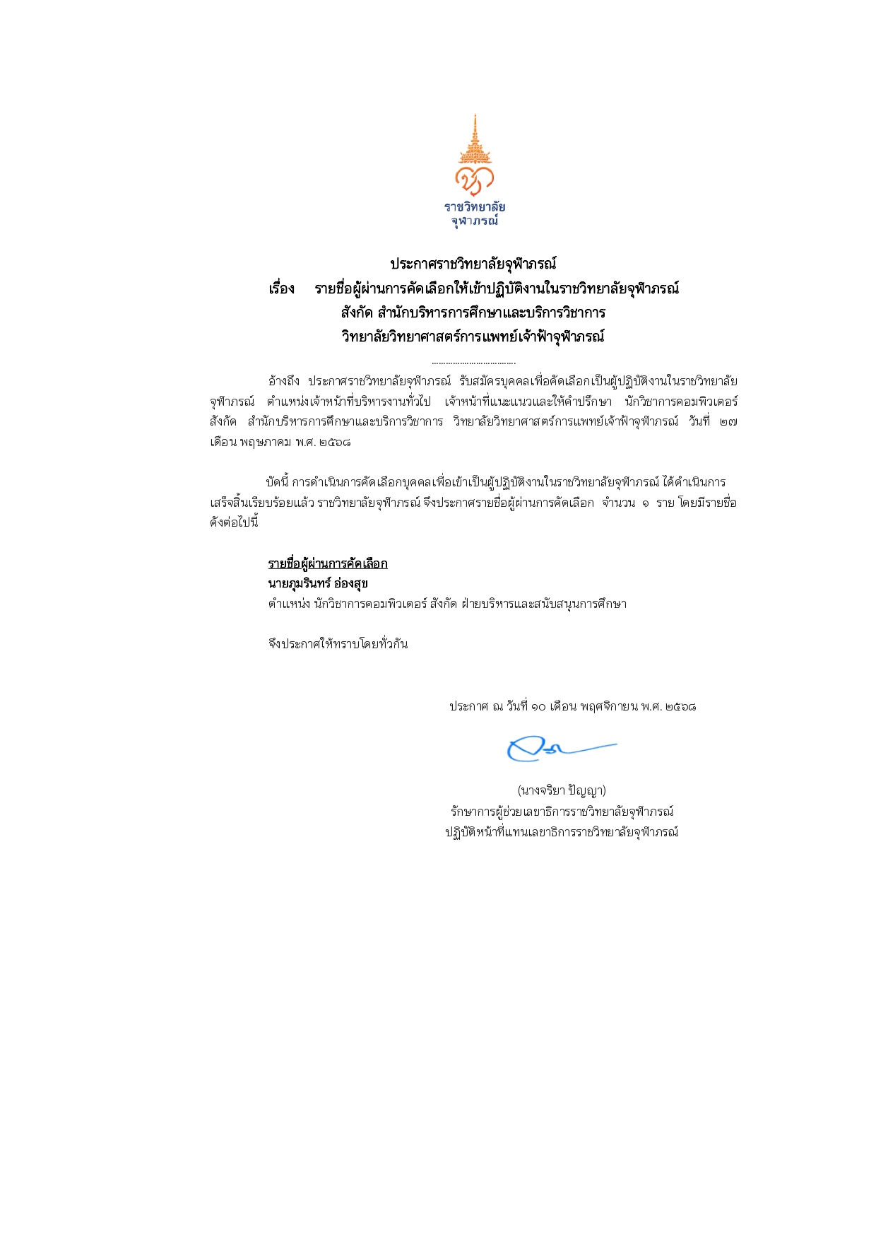 ประกาศรายชื่อผู้ผ่านการคัดเลือกให้เข้าปฏิบัติงานในราชวิทยาลัยจุฬาภรณ์ ตำแหน่งนักวิชาการคอมพิวเตอร์ สังกัด ฝ่ายบริหารและสนับสนุนการศึกษา สำนักบริหารการศึกษาและบริการวิชาการ วิทยาลัยวิทยาศาสตร์การแพทย์เจ้าฟ้าจุฬาภรณ์