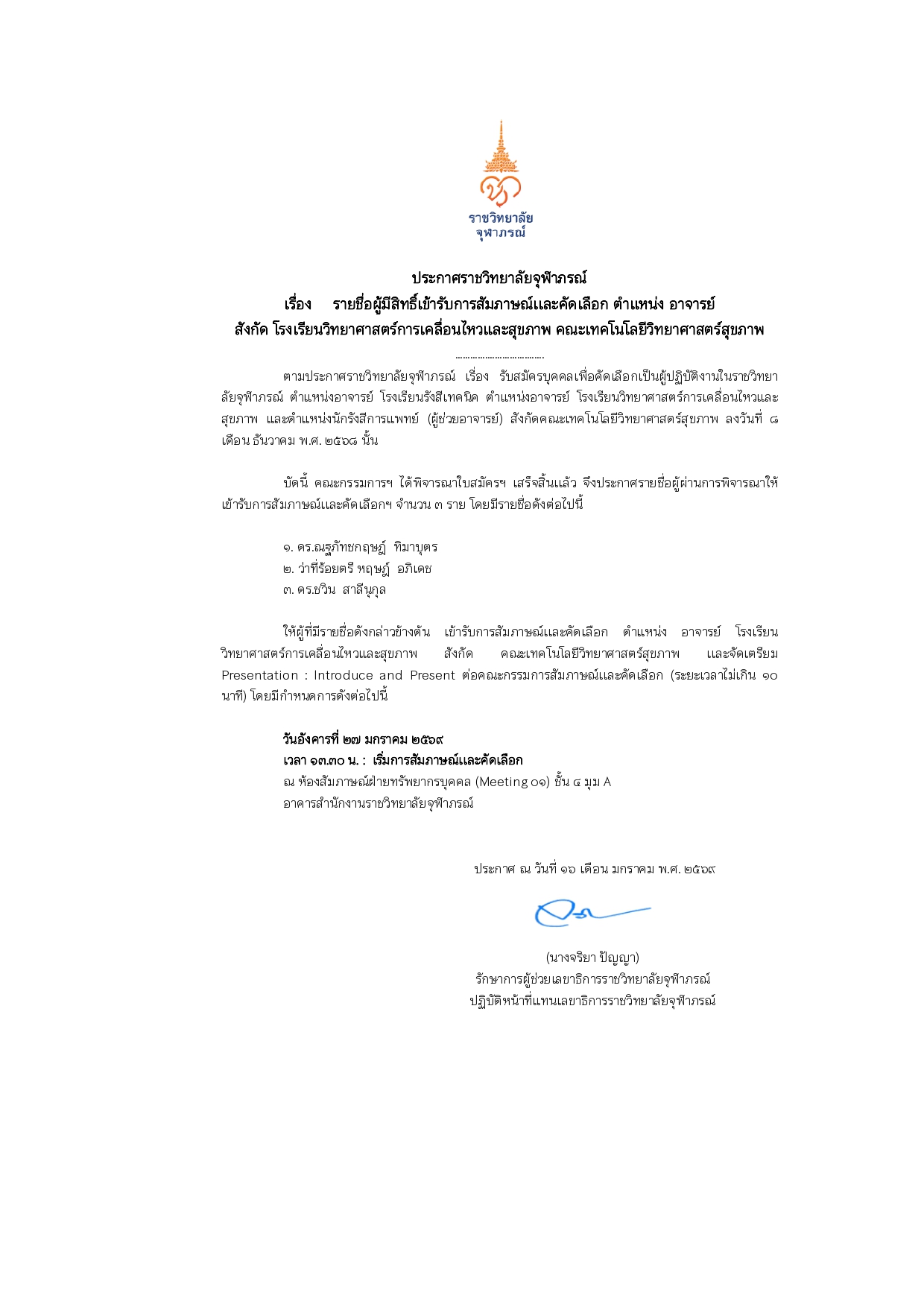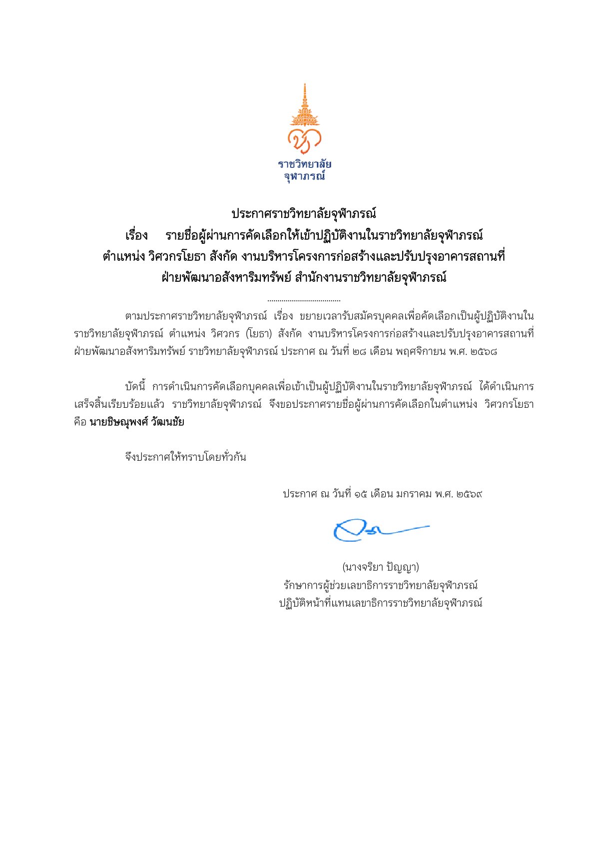 ประกาศรายชื่อผู้ผ่านการคัดเลือกให้เข้าปฏิบัติงานในราชวิทยาลัยจุฬาภรณ์ ตำแหน่ง นักวิชาการคอมพิวเตอร์ (วิเคราะห์และออกแบบระบบ) สังกัดงานวิเคราะห์และพัฒนาโปรแกรม ด้านการบริหาร ฝ่ายเทคโนโลยีสารสนเทศ