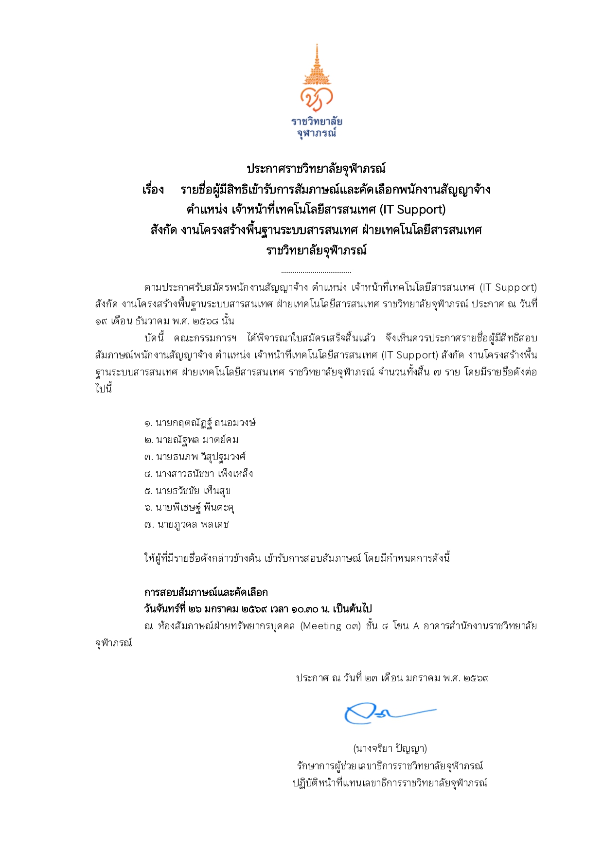 ประกาศรายชื่อผู้มีสิทธิเข้ารับการสัมภาษณ์และคัดเลือกพนักงานสัญญาจ้าง ตำแหน่ง เจ้าหน้าที่เทคโนโลยีสารสนเทศ (IT Support) สังกัด งานโครงสร้างพื้นฐานระบบสารสนเทศ ฝ่ายเทคโนโลยีสารสนเทศ ราชวิทยาลัยจุฬาภรณ์