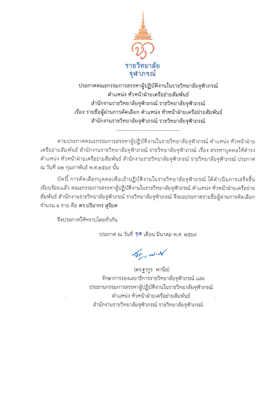 ประกาศสรรหาบุคคลให้ดำรงตำแหน่ง หัวหน้าฝ่ายประกันคุณภาพ โรงงานผลิตเภสัชภัณฑ์ในพระดำริ สำนักงานราชวิทยาลัยจุฬาภรณ์ ราชวิทยาลัยจุฬาภรณ์ ครั้งที่ ๒ ประกาศ ณ วันที่ 10 มีนาคม 2569