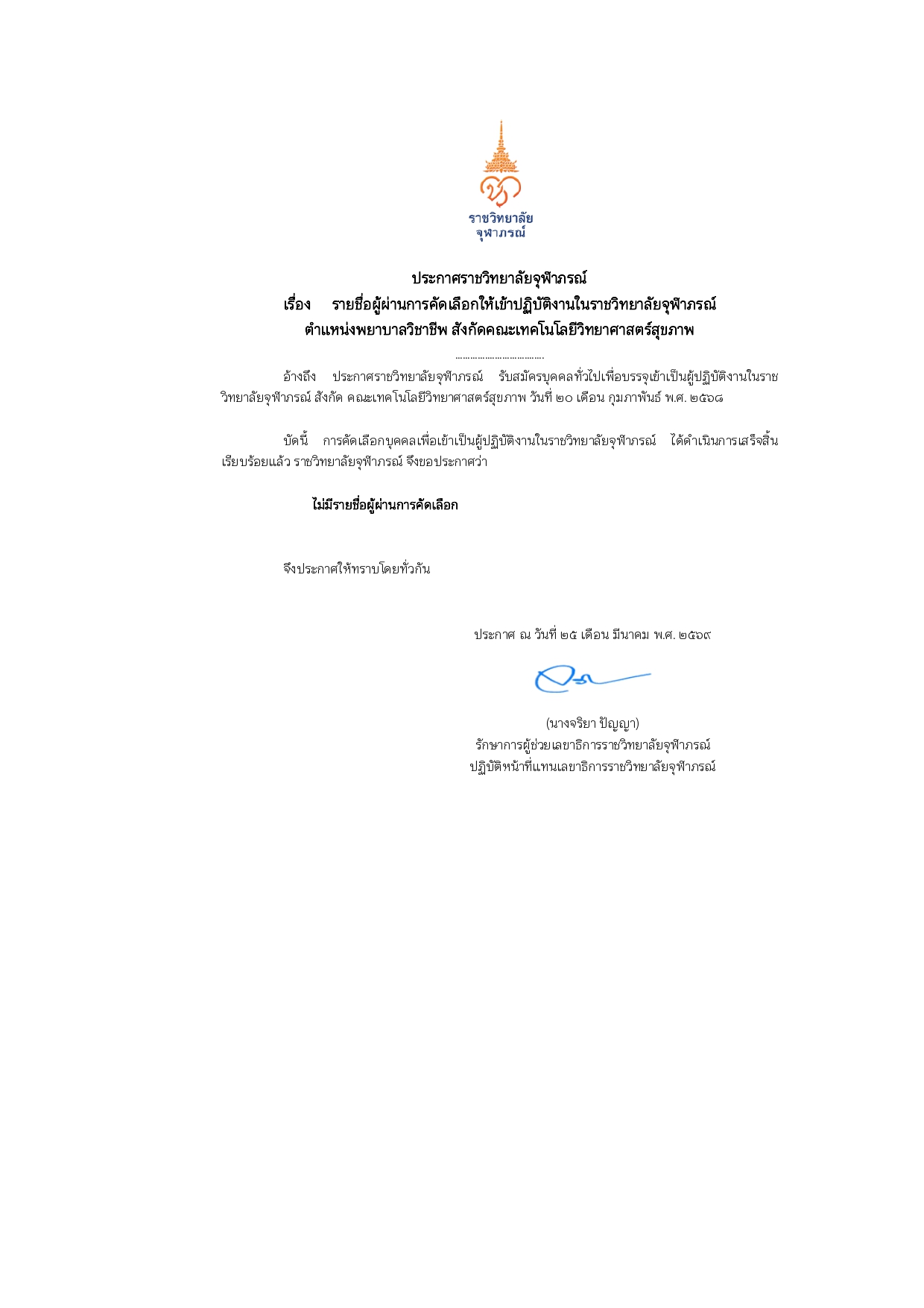 ประกาศรายชื่อผู้ผ่านการคัดเลือกให้เข้าปฏิบัติงานในราชวิทยาลัยจุฬาภรณ์ ตำแหน่ง นักวิชาการคอมพิวเตอร์ (วิเคราะห์และออกแบบระบบ) สังกัดงานวิเคราะห์และพัฒนาโปรแกรม ด้านการบริการสุขภาพ ฝ่ายเทคโนโลยีสารสนเทศ