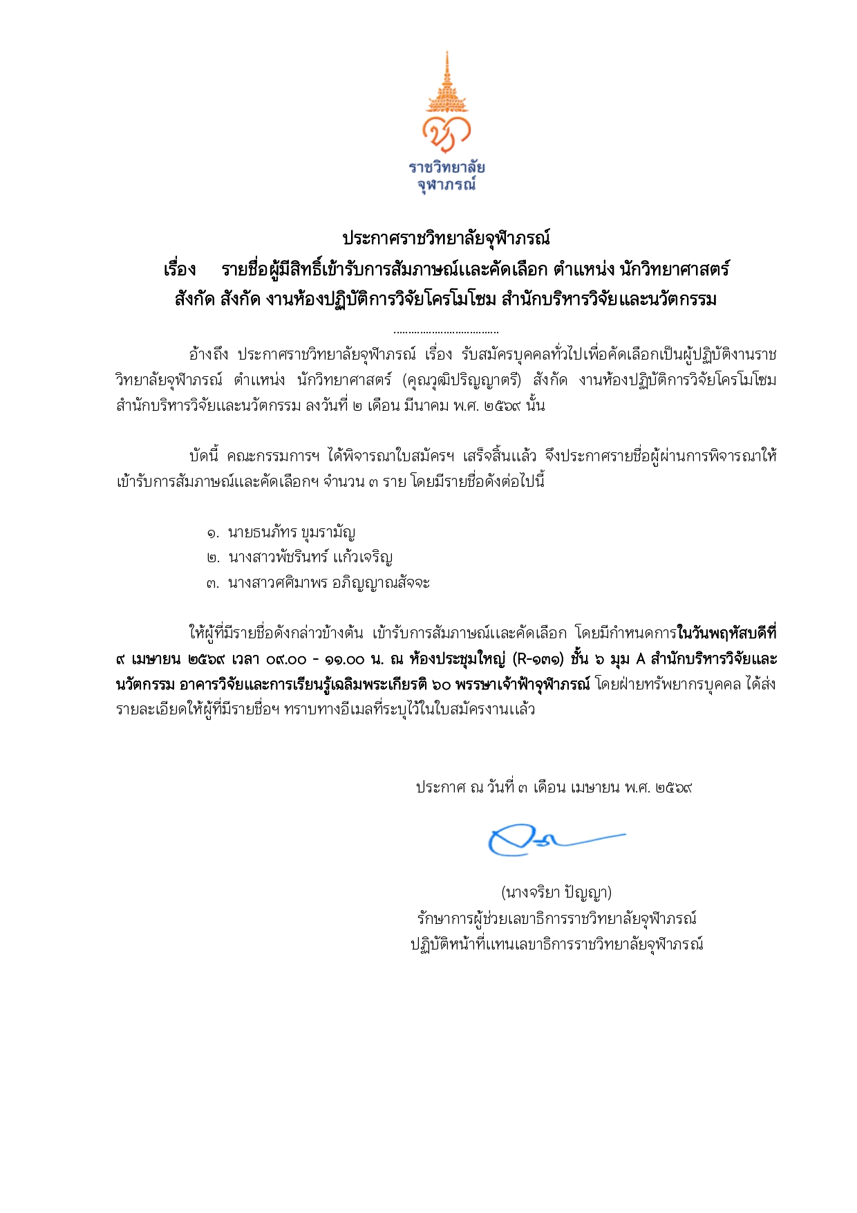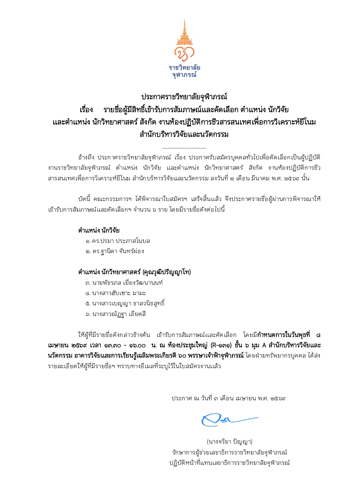 รายชื่อผู้มีสิทธิ์เข้ารับการสัมภาษณ์เเละคัดเลือก ตำแหน่ง นักวิจัย เเละตำแหน่ง นักวิทยาศาสตร์ สังกัด งานห้องปฏิบัติการชีวสารสนเทศเพื่อการวิเคราะห์ยีโนม สำนักบริหารวิจัยและนวัตกรรม