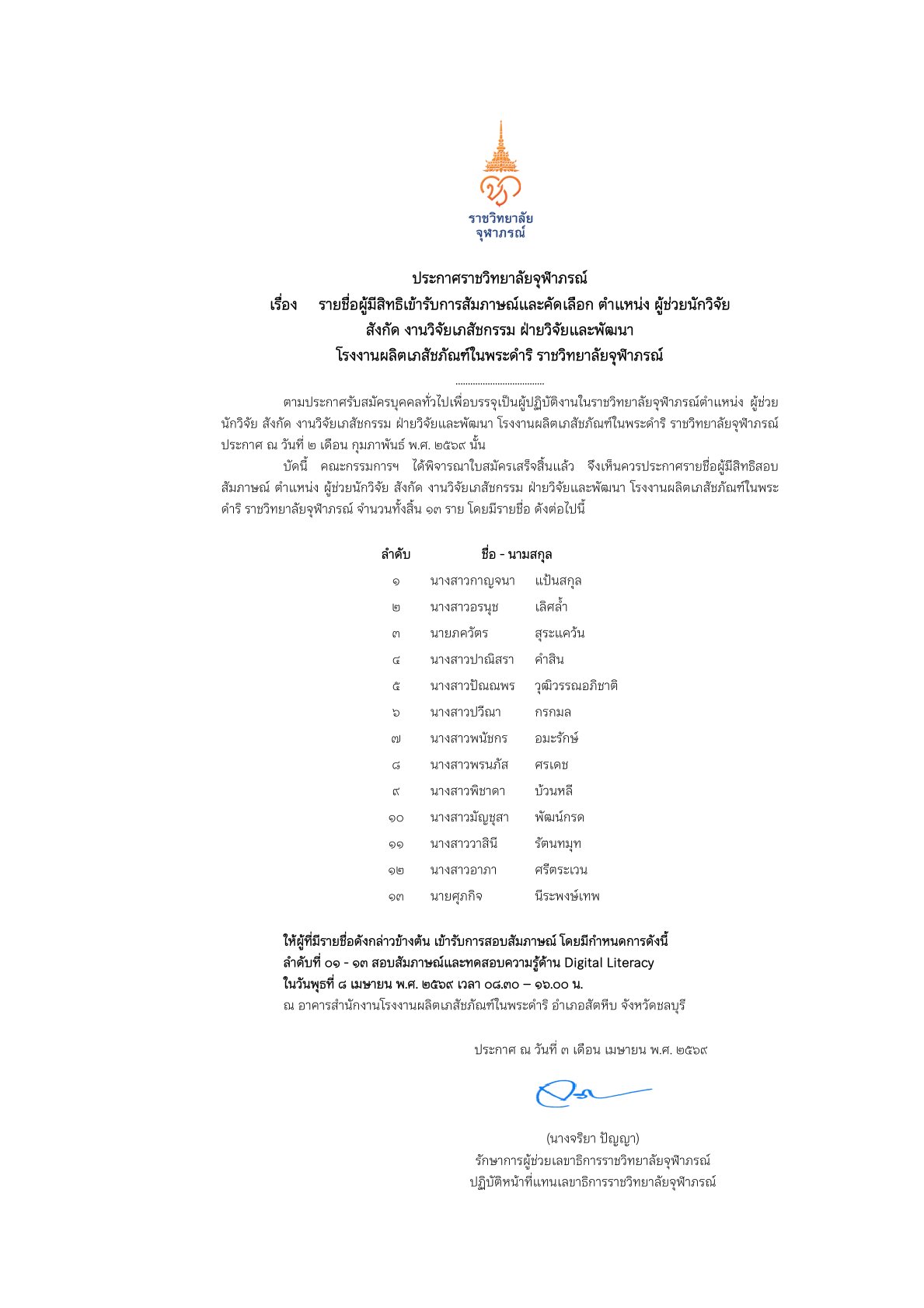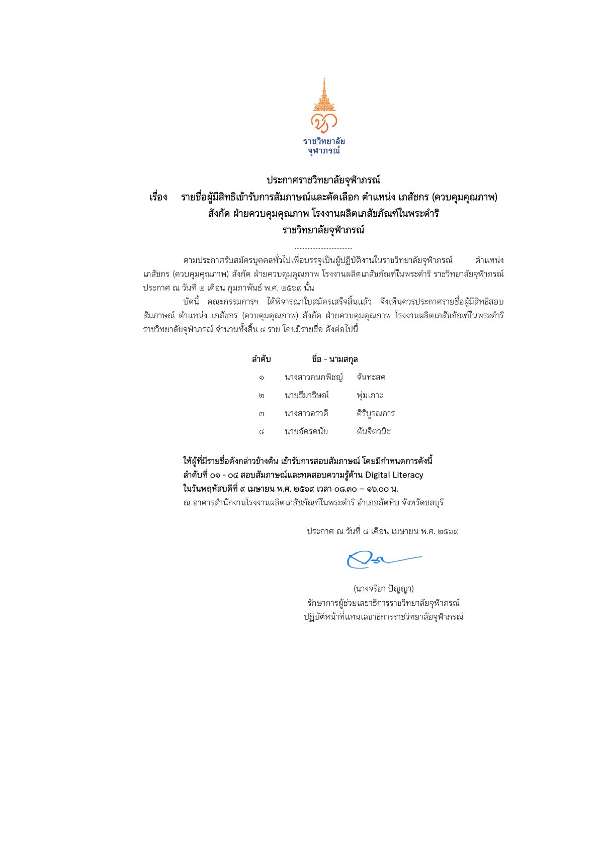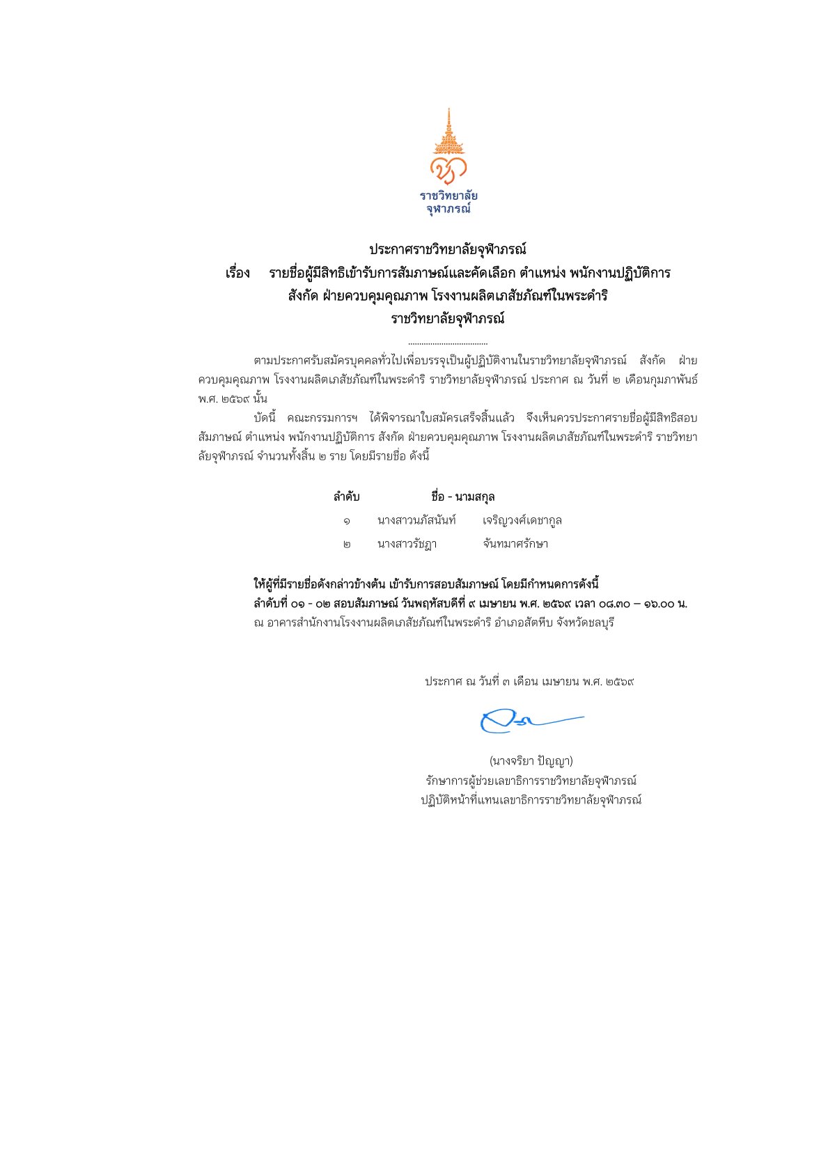 ประกาศรายชื่อผู้มีสิทธิเข้ารับการสัมภาษณ์และคัดเลือก ตำแหน่ง เจ้าหน้าที่ประกันคุณภาพ สังกัด ฝ่ายประกันคุณภาพ โรงงานผลิตเภสัชภัณฑ์ในพระดำริ ราชวิทยาลัยจุฬาภรณ์