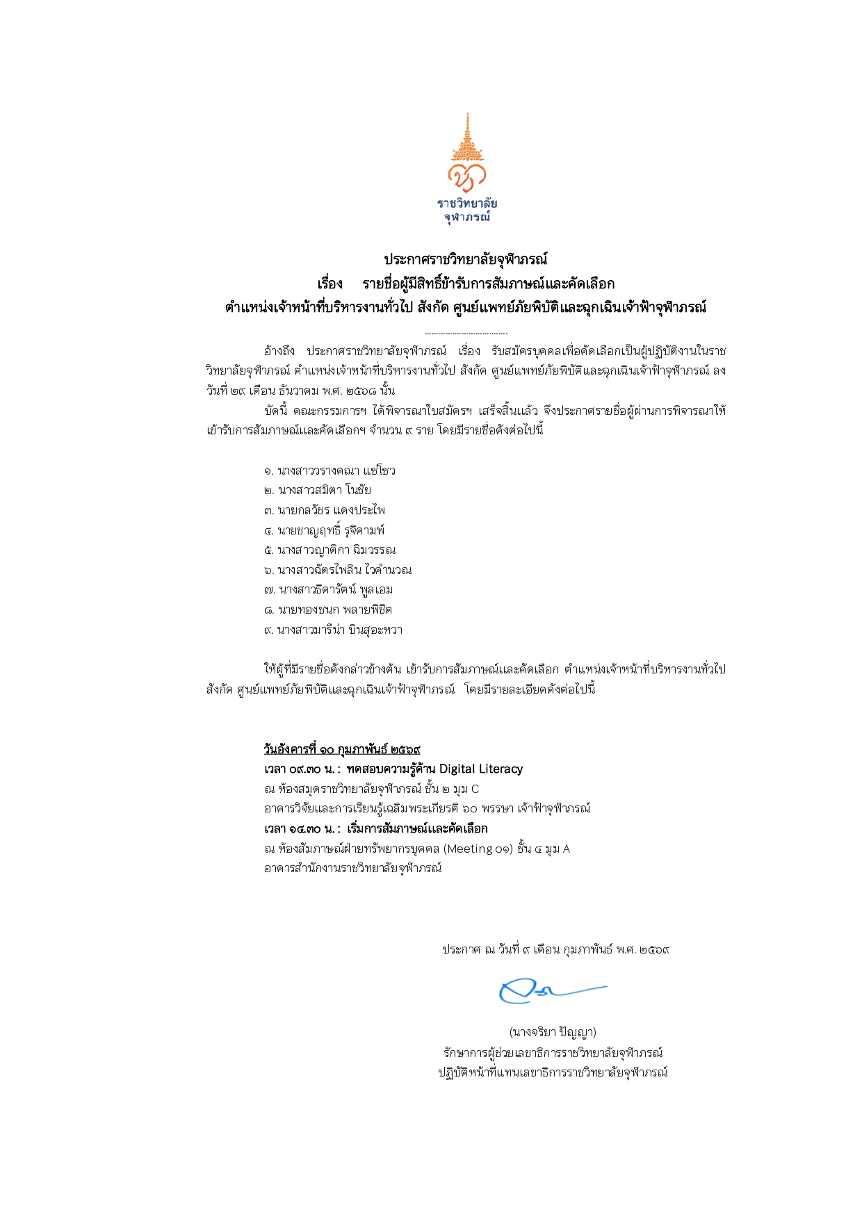 รายชื่อผู้ผ่านการคัดเลือกให้เข้าปฏิบัติงานในราชวิทยาลัยจุฬาภรณ์ ตำแหน่ง อาจารย์ สังกัด โรงเรียนวิทยาศาสตร์การเคลื่อนไหวและสุขภาพ คณะเทคโนโลยีวิทยาศาสตร์สุขภาพ