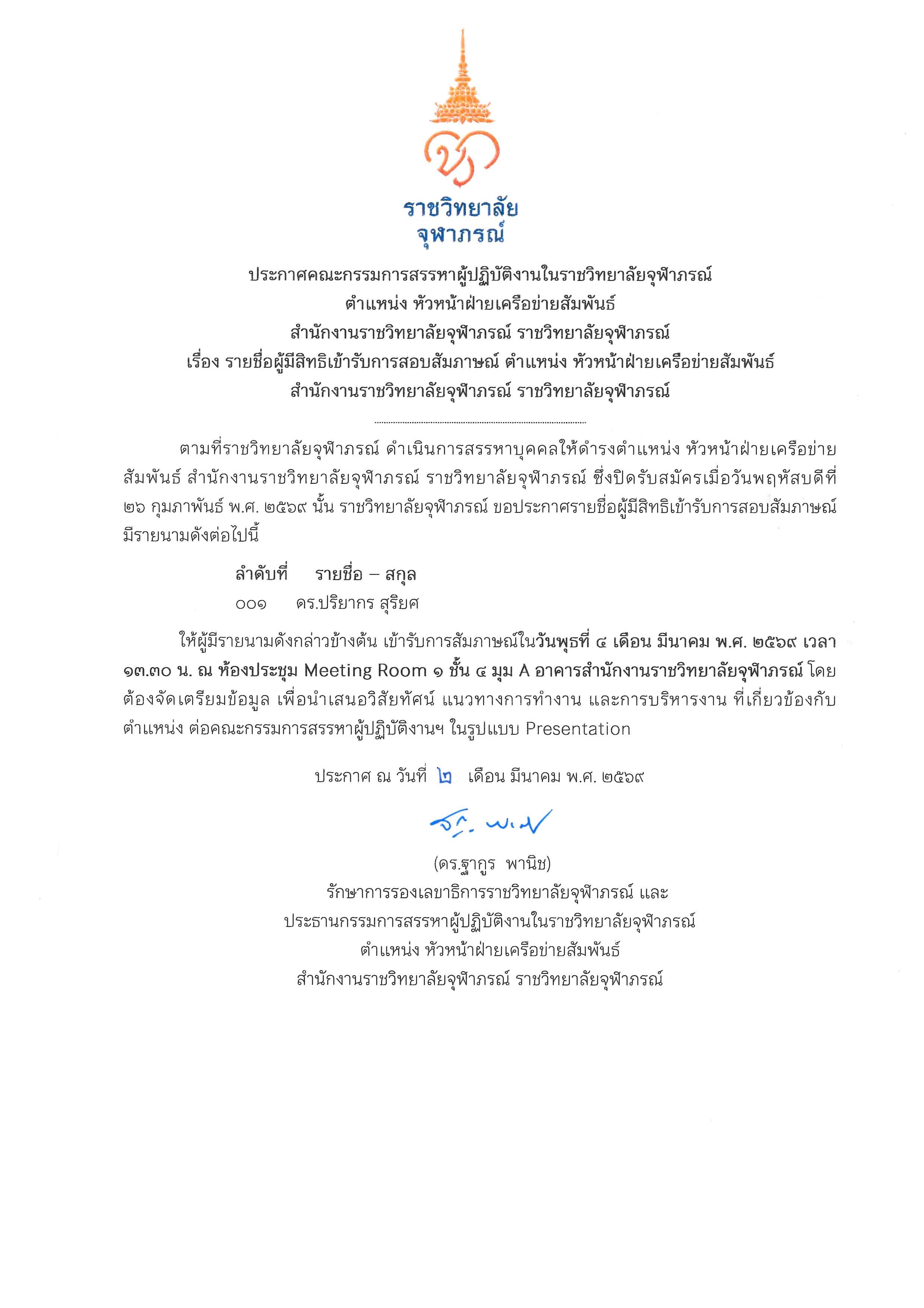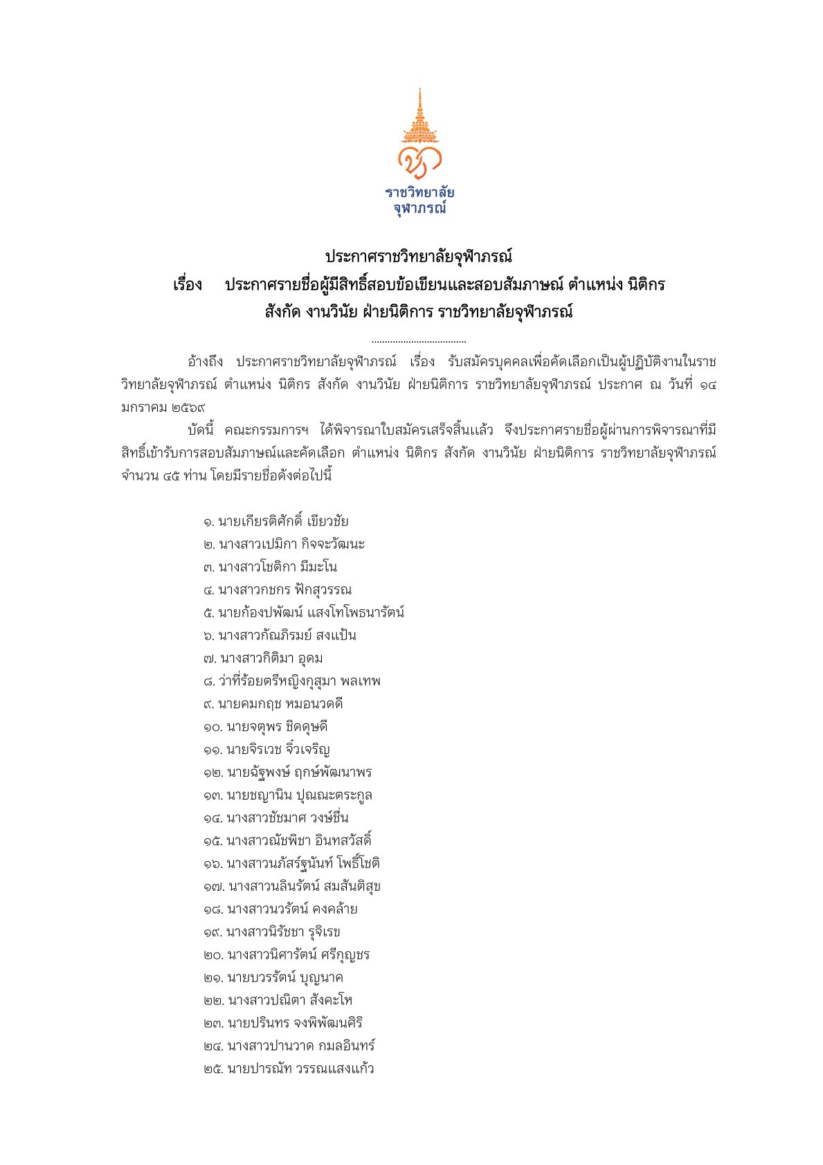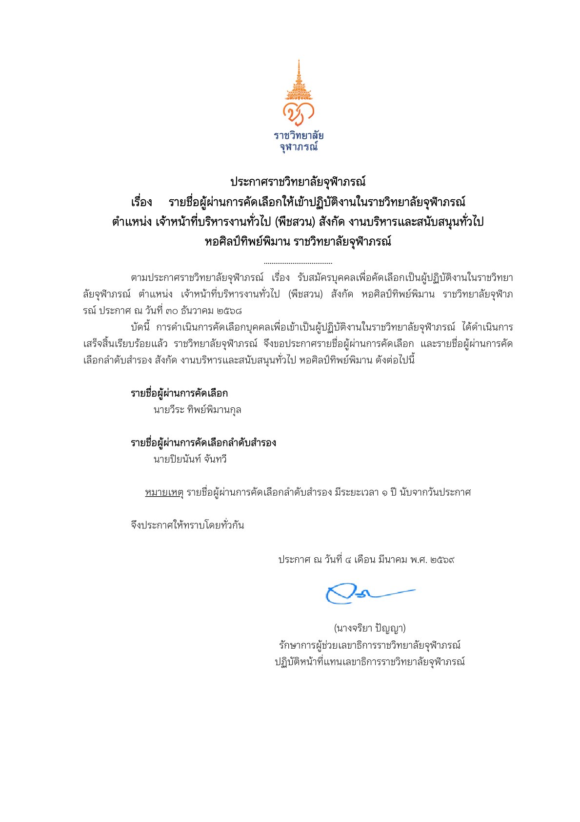 ประกาศรายชื่อผู้ผ่านการคัดเลือกให้เข้าปฏิบัติงานในราชวิทยาลัยจุฬาภรณ์ ตำแหน่ง เจ้าหน้าที่บริหารงานทั่วไป (พืชสวน) สังกัด งานบริหารและสนับสนุนทั่วไป หอศิลป์ทิพย์พิมาน ณ วันที่ ๔/๐๓/๒๕๖๙