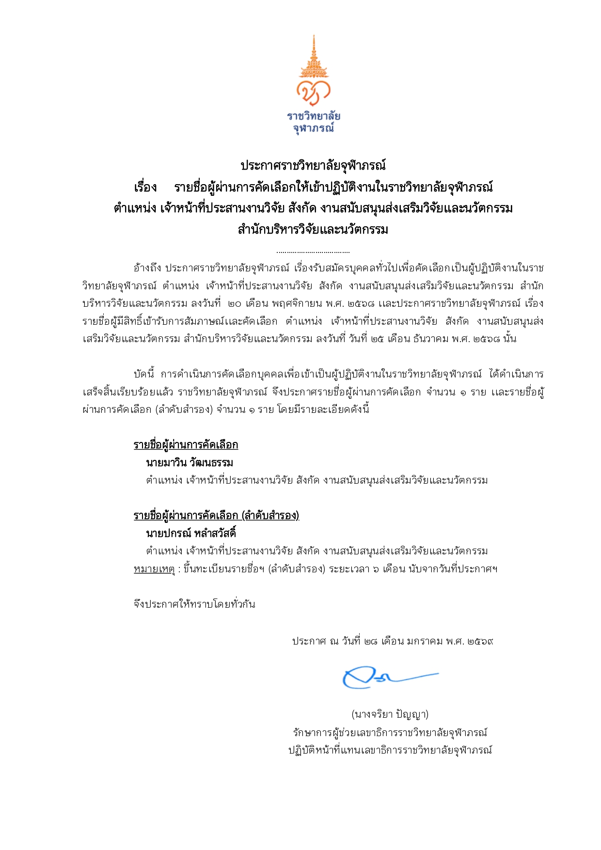 รายชื่อผู้ผ่านการคัดเลือกให้เข้าปฏิบัติงานในราชวิทยาลัยจุฬาภรณ์ ตำแหน่ง เจ้าหน้าที่ประสานงานวิจัย สังกัด งานสนับสนุนส่งเสริมวิจัยและนวัตกรรม สำนักบริหารวิจัยและนวัตกรรม