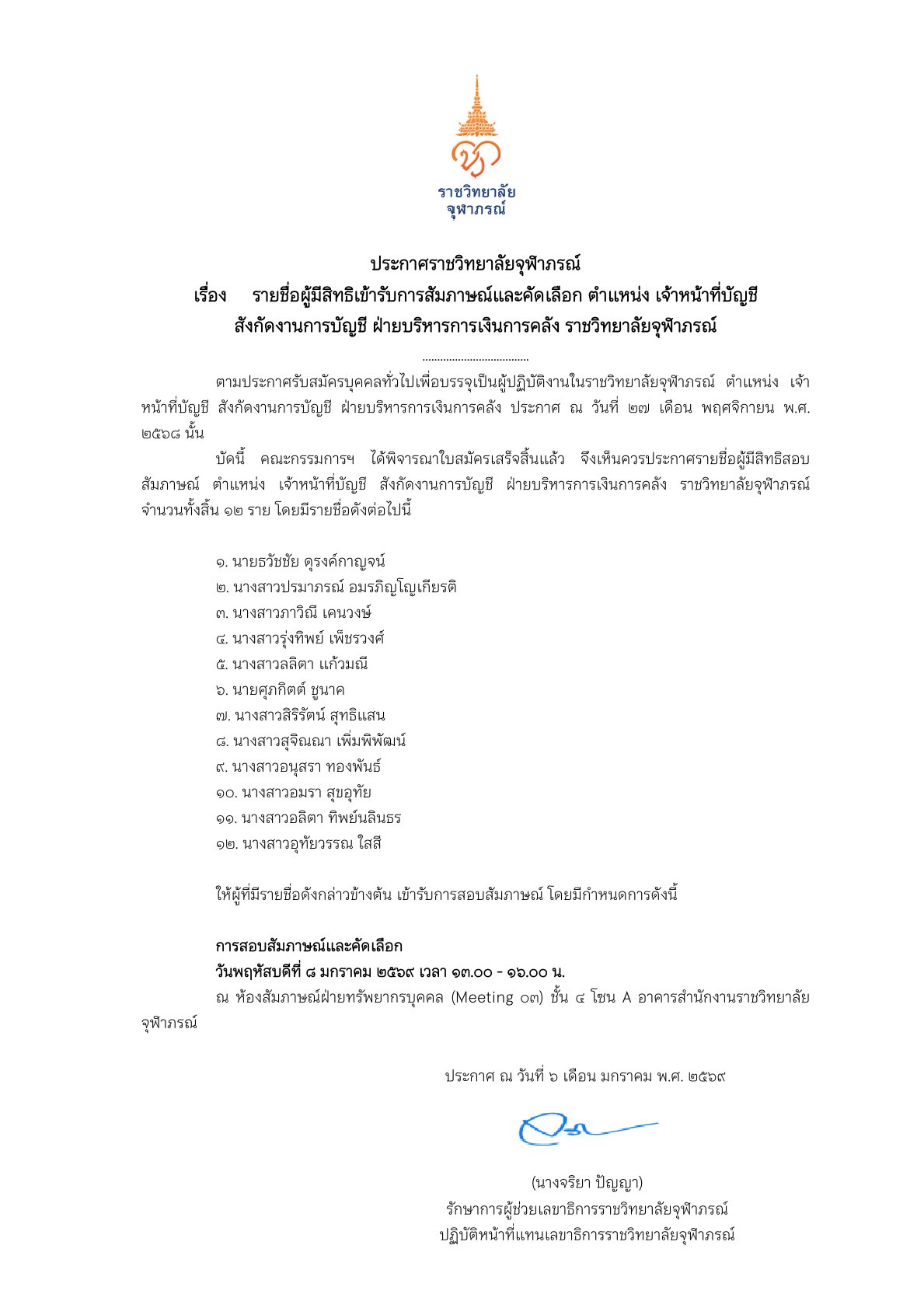 ประกาศรายชื่อผู้ผ่านการคัดเลือกให้เข้าปฏิบัติงานในราชวิทยาลัยจุฬาภรณ์ ตำแหน่ง นักวิชาการศึกษา สังกัด คณะเทคโนโลยีวิทยาศาสตร์สุขภาพ ณ วันที่ 26/12/2568
