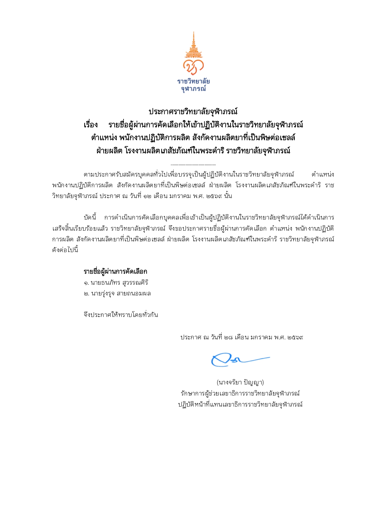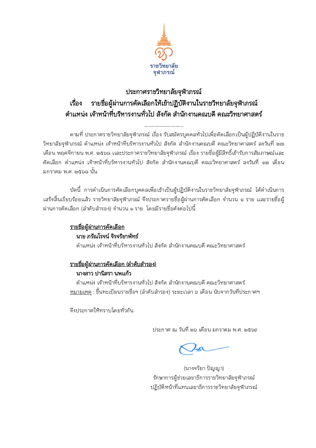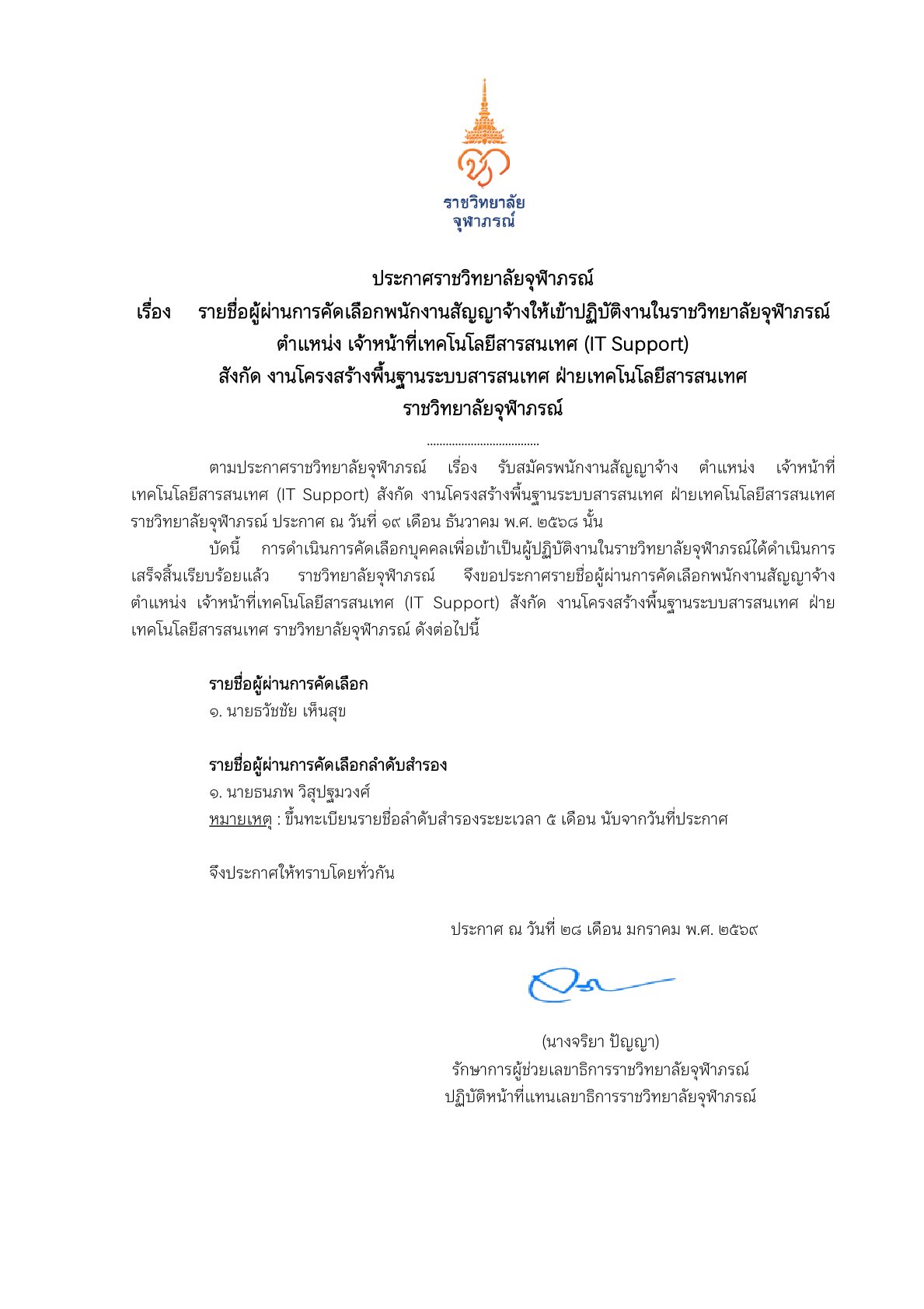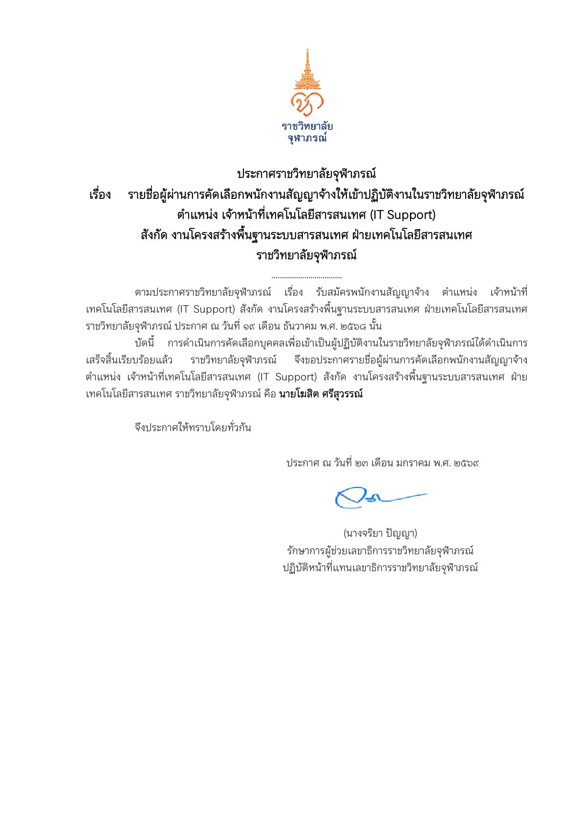 ประกาศรายชื่อผู้ผ่านการคัดเลือกพนักงานสัญญาจ้างให้เข้าปฏิบัติงานในราชวิทยาลัยจุฬาภรณ์ ตำแหน่ง เจ้าหน้าที่เทคโนโลยีสารสนเทศ (IT Support) สังกัด งานโครงสร้างพื้นฐานระบบสารสนเทศ ฝ่ายเทคโนโลยีสารสนเทศ ราชวิทยาลัยจุฬาภรณ์